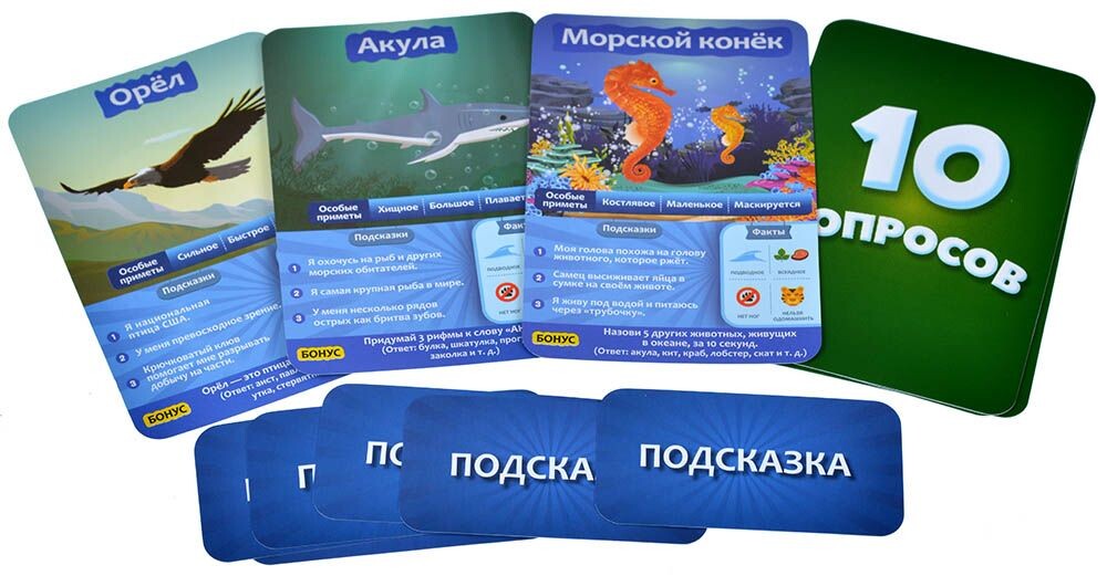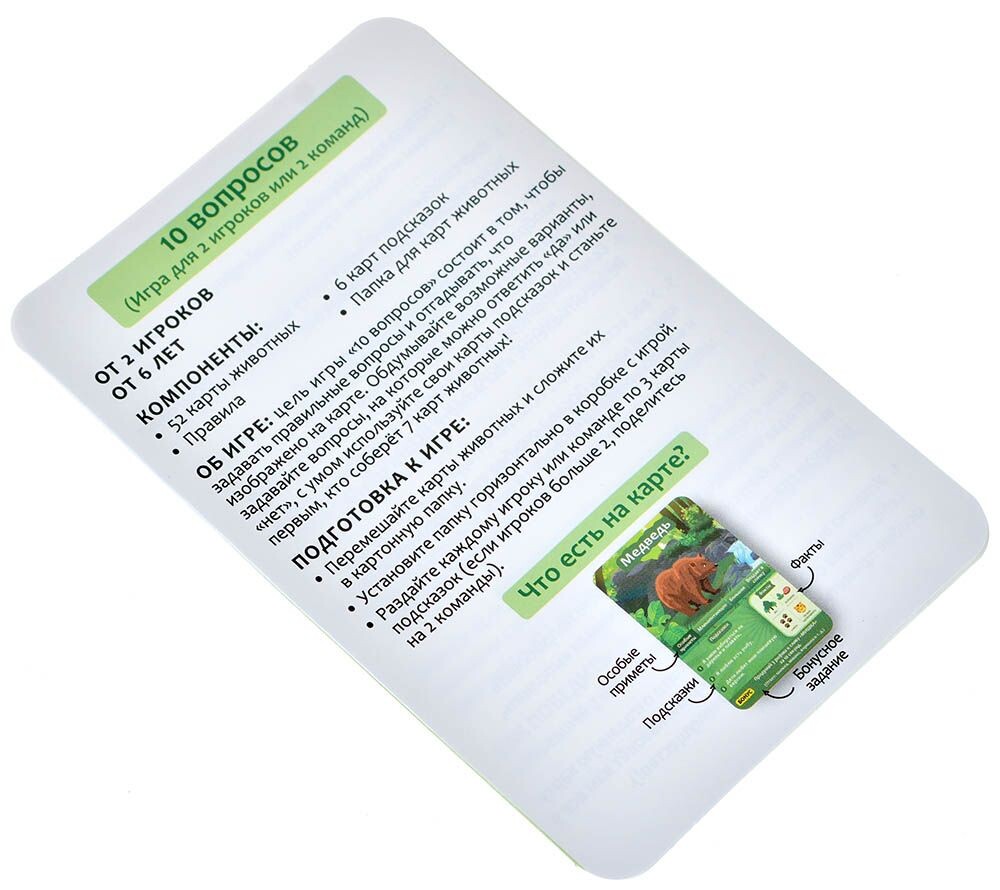 В данной игре участников ждут карточки с различными животными, а также специальные вопросы. Получив карты на руки, каждый игрок пытается угадать, какое животное изображено на карте соседа. На вопросы участник может отвечать только "да", либо "нет", а задать можно не более десяти вопросов. Главный аспект игры - получится ли у вас за десять вопросов понять, что за животное изображено? Игрок, который отгадает наибольшее количество животных, станет победителем!