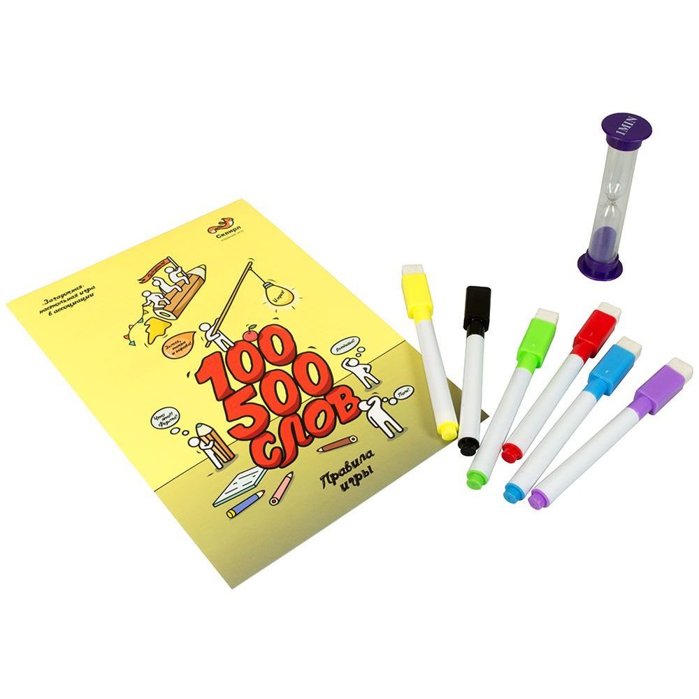 Игры на ассоциации - короли вечеринок, "100500 слов" продолжает привычный нам подход. Каждому игроку раздается по 6 карт, на которых написано одно слово. В свой ход игроку нужно выбрать несколько карточек, придумать объединяющую эти слова ассоциацию, записать ее, после чего выложить эти карты в открытую на стол.