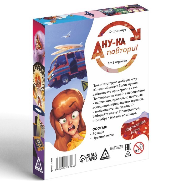 Данная игра проверит вашу память и внимательность. В коробке вы найдете карты, на которые нужно будет придумать и назвать ассоциацию. При этом, такую процедуру нужно будет сделать каждому игроку, не повторяясь и произнося при этом ассоциацию предыдущего участника перед этим. Как вы понимаете, с каждым ходом игра все сложнее, и все труднее запоминать сказанное перед этим. Кто сможет продержаться дольше остальных, получит победные очки. Собирайтесь за одним столом и докажите остальным игрокам, что вы лучший!