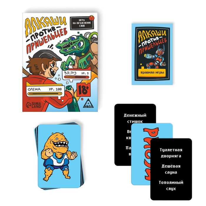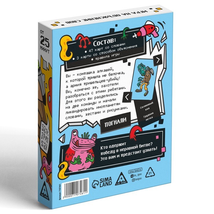 Поделитесь игроками на две команды и дайте отпор прибывшим пришельцам! С помощью различных способов вам предстоит объяснять слова своей команде, причем делать это по буквам. В зависимости от выпавшего способа объяснения, игроки будут рисовать, говорить, показывать, и часто в одном слове разные буквы будут объясняться разными способами. Если команда догадается, карта останется у вас. В конце игры та команда, которая набрала больше карт, то есть победила больше пришельцев, станет победителем!