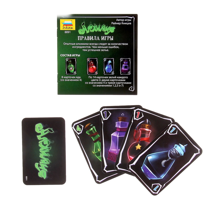 Алхимия - поистине многогранное и благородное искусство, которое добралось и до карточных игр! В настольной игре "Алхимия" игроки стараются избежать неудач, не пополняя руку картами зелий с центра стола, ведь чем больше у вас карт, тех хуже счет. В начале раунда все получают карты трех мастей (от 1 до 7) и четвертую масть, джокера, в которой все карты имеют значение 4. Игрок может сбросить карту с руки в стопку соответствующего цвета (с джокером это можно сделать в любую стопку), и показывает сумму всех карт в стопке. Если сумма вышла больше 13, и котел переполнен, игрок забирает все карты на руку. Игра подходит к концу, когда разыграны все карты, и идет сравнение по каждой из трех мастей. Каждый джокер, к примеру, приносит два штрафных очка, а победителем объявляется игрок с нименьшими штрафами за игру. Так что вперед, постигать темное искусство!