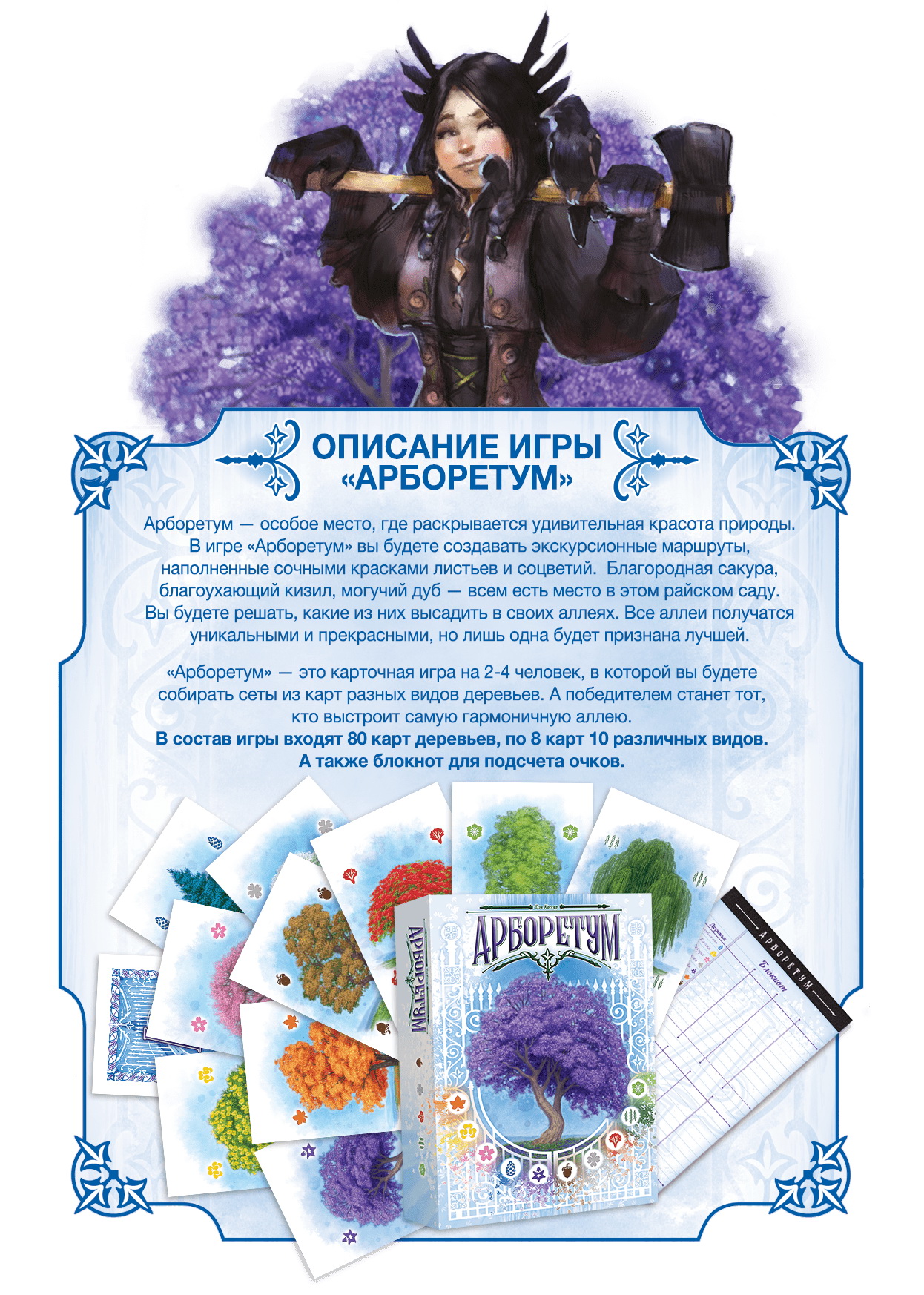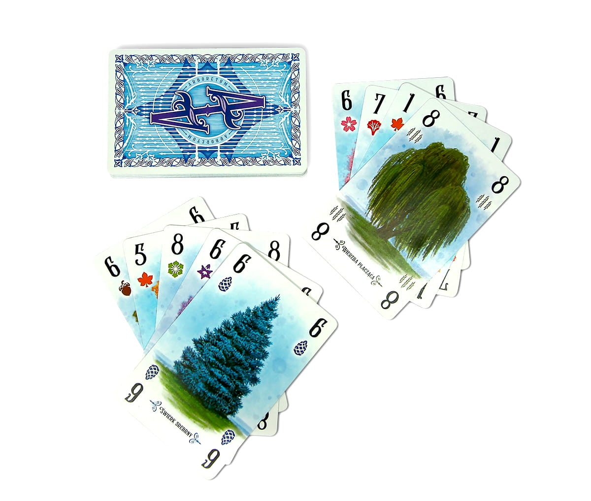 Шум ветра в кронах дерьвьев, шелест листвы, мерно опускающейся на землю, - нет сомнения, вы в настольной игре "Арборетум". Создайте свой сад с помощью карт-деревьев, которые раздаются в начале игры. Самые длинные тропинки вдоль деревьев принесут игрокам победные очки, а карты опредленного цвета в сочетании приблизят к победе. Прекрасные пасторальные иллюстрации и вдумчивый игровой процесс порадуют всех игроков, а особенно любителей ботаники.