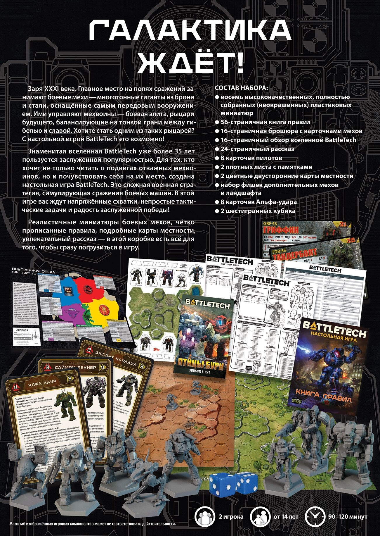 Уникальная возможность прикосунться к легендарной вселенной! В настольной игре BattleTech каждый игрок берет под свой контроль одну или несколько гигантских шагающих боевых машин (BattleMechs, также называемых мехами) и сражается, пока их противник не будет уничтожен или пока не будут выполнены задачи сценария. Данный комплект представит вам восемь фигурок мехов в высоком качестве и с разными характеристиками, и глубокие тактические правила. Устраивайтесь поудобнее, и да начнется битва!