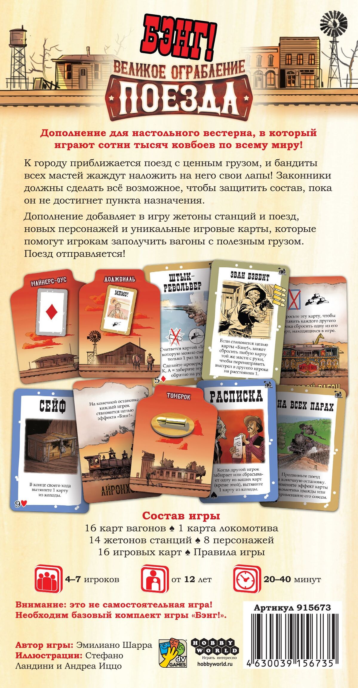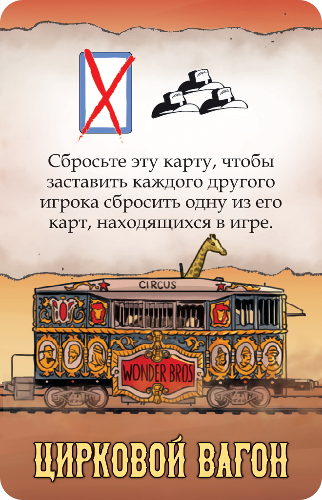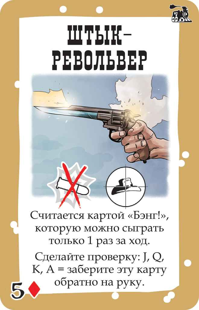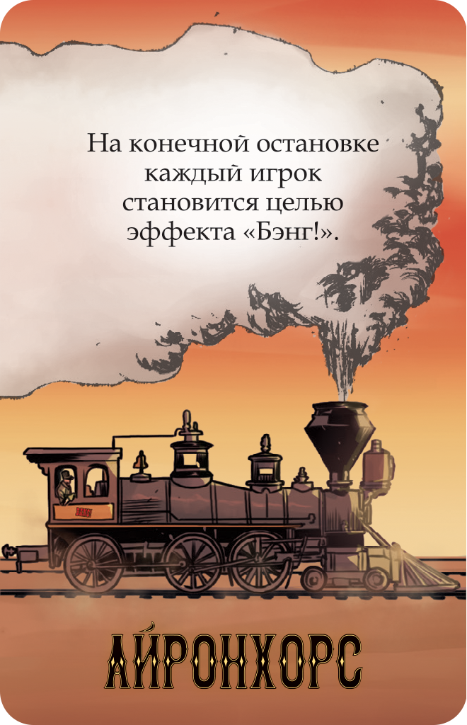 Теперь в игре появится специальные карты с поездом и станциями - теперь вестерн станет еще более каноничным! Выплачивая деньги на станциях и выкладывая карты вагонов, участники будут захватывать поезд, в то время, как шериф с помощниками постараются не допустить ограбления. Применяйте различное оружие и приемы, дабы противостоять своим врагам и не допустить победы противоборствующей команды. Уникальные персонажи, напряженные перестрелки и веселые противостояния ждут вас!
