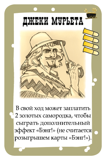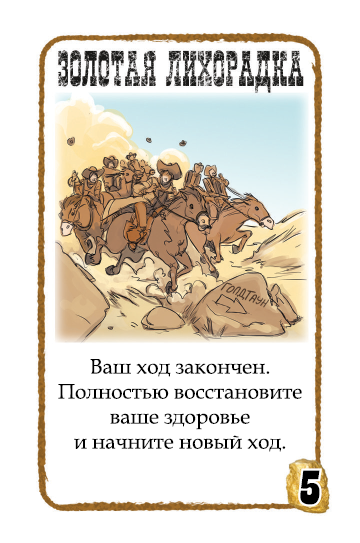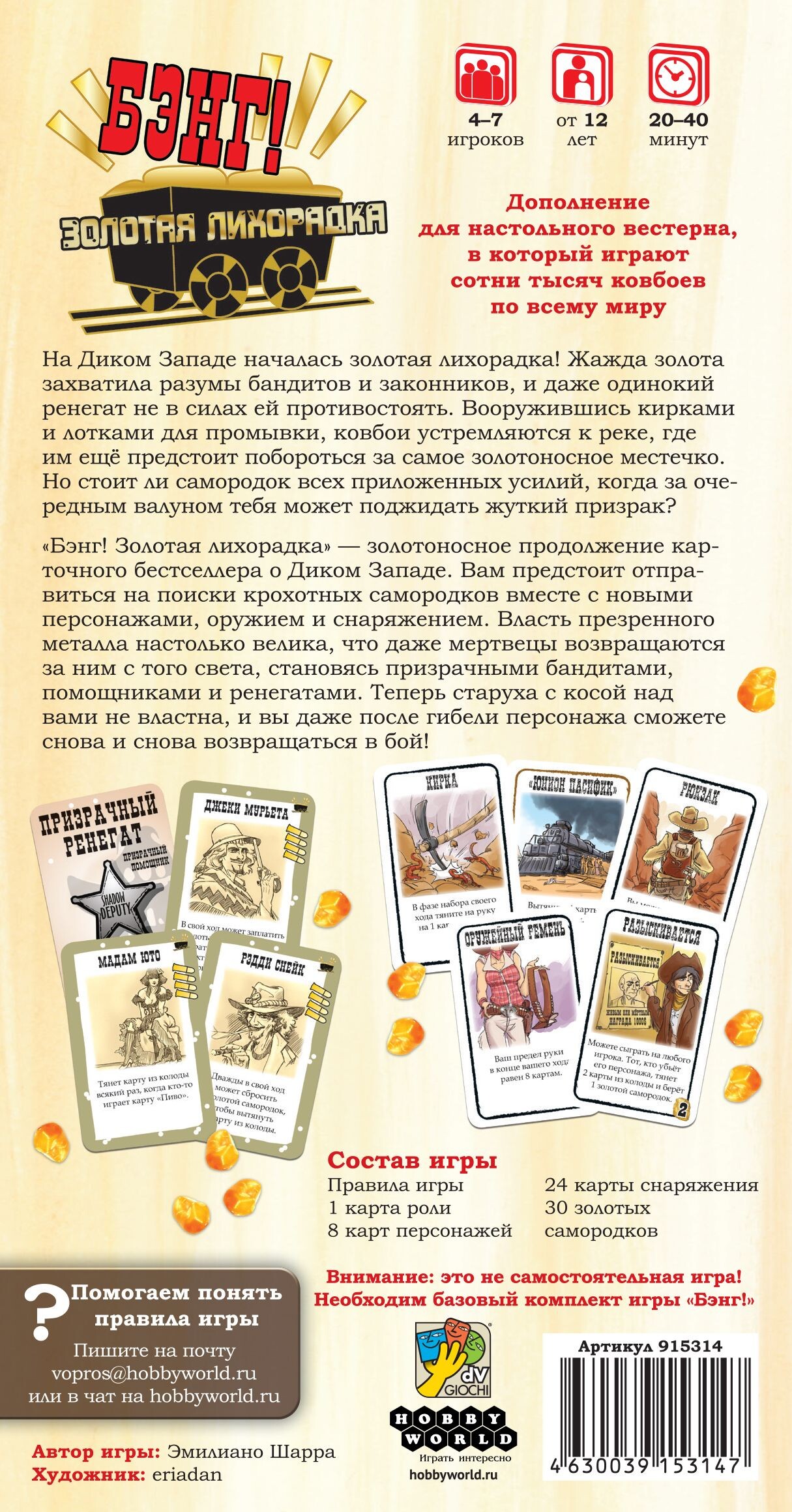 Расширение "Золотая лихорадка" для знаменитой игры "БЭНГ!" включает в себя карты новых персонажей, возможность собирать золотые самородки для покупки нового снаряжения, и возможность воскресить павшего персонажа другого игрока, дабы он продолжил учавствовать в перестрелке. Так что теперь играть станет еще веселее и интереснее. Заряжайте револьверы, седлайте лошадей, Дикий Запад ждет!