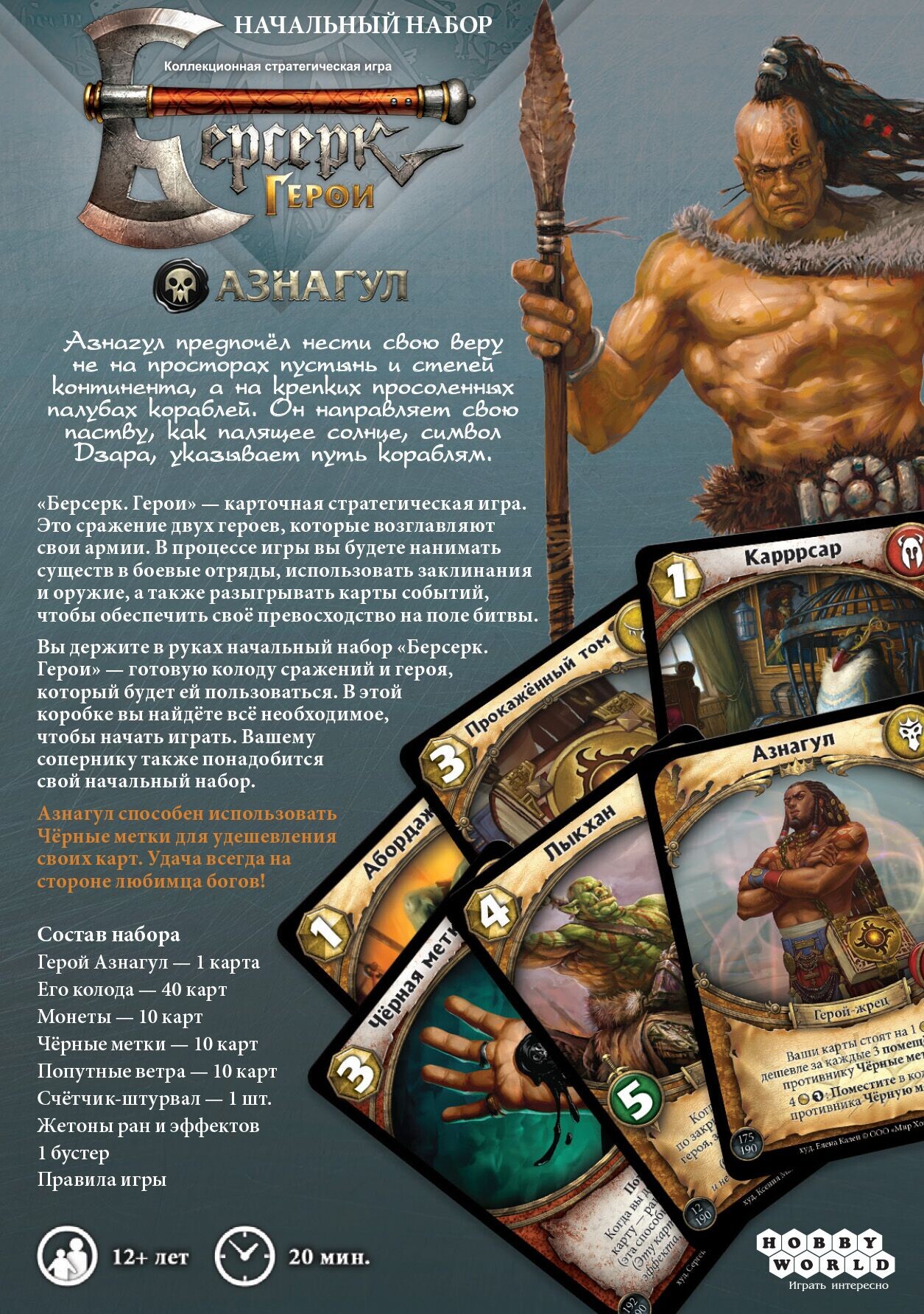 Герои, пришла пора показать свое мастерство в поединке со своим оппонентом! "Берсерк. Герои" - карточная стратегическая игра, в которой игрокам предстоит нанимать боевые отряды, использовать карты оружий, заклинаний, и событий, чтобы одолеть соперника. Наборы "Черные паруса" добавляют несколько новых механик в привычную формулу - теперь можно поместить слабые карты в колоду противника, использовать карты вымогательства, или карты неуловимости. Герой Азнагул, жрец морей, удешевляет стоимость всех своих карт за счёт Чёрных меток в колоде противника. Данный набор является сбалансированным для одного игрока и содержит все, чтобы начать играть. Учтите, вашему оппоненту также понадобится базовый набор. Пора на поле битвы!