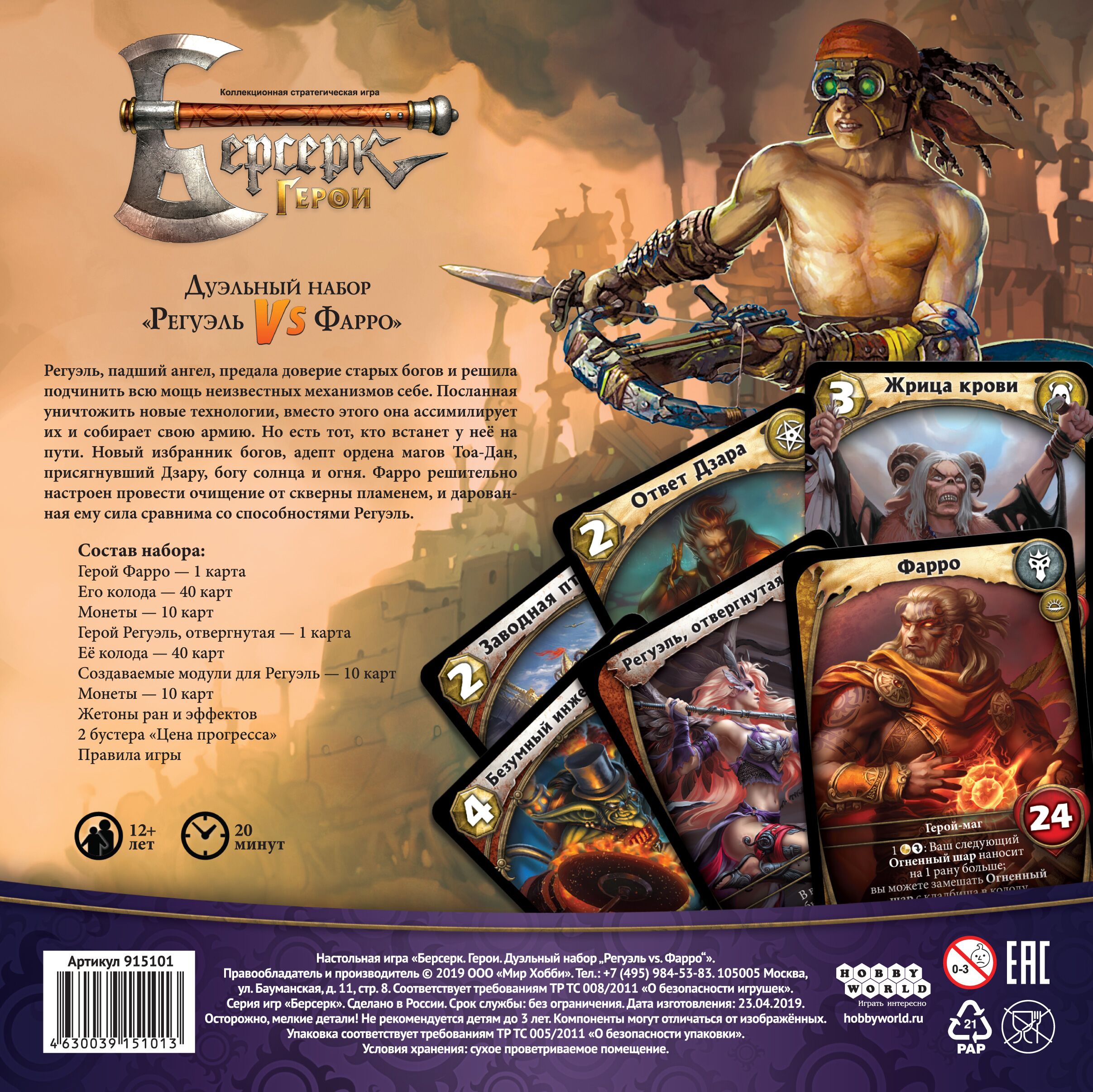 Герои, пришла пора показать свое мастерство в поединке со своим оппонентом! "Берсерк. Герои" - карточная стратегическая игра, в которой игрокам предстоит нанимать боевые отряды, использовать карты оружий, заклинаний, и событий, чтобы одолеть соперника. Данный большой набор содержит две сбалансированные колоды для дуэли. Регуэль, падший ангел, улучшающая существ с помощью механизмов, сойдется в бою с магом Фарро, способным усиливать свои заклинания. Кто же победит? Ответ вы найдете на поле битвы!