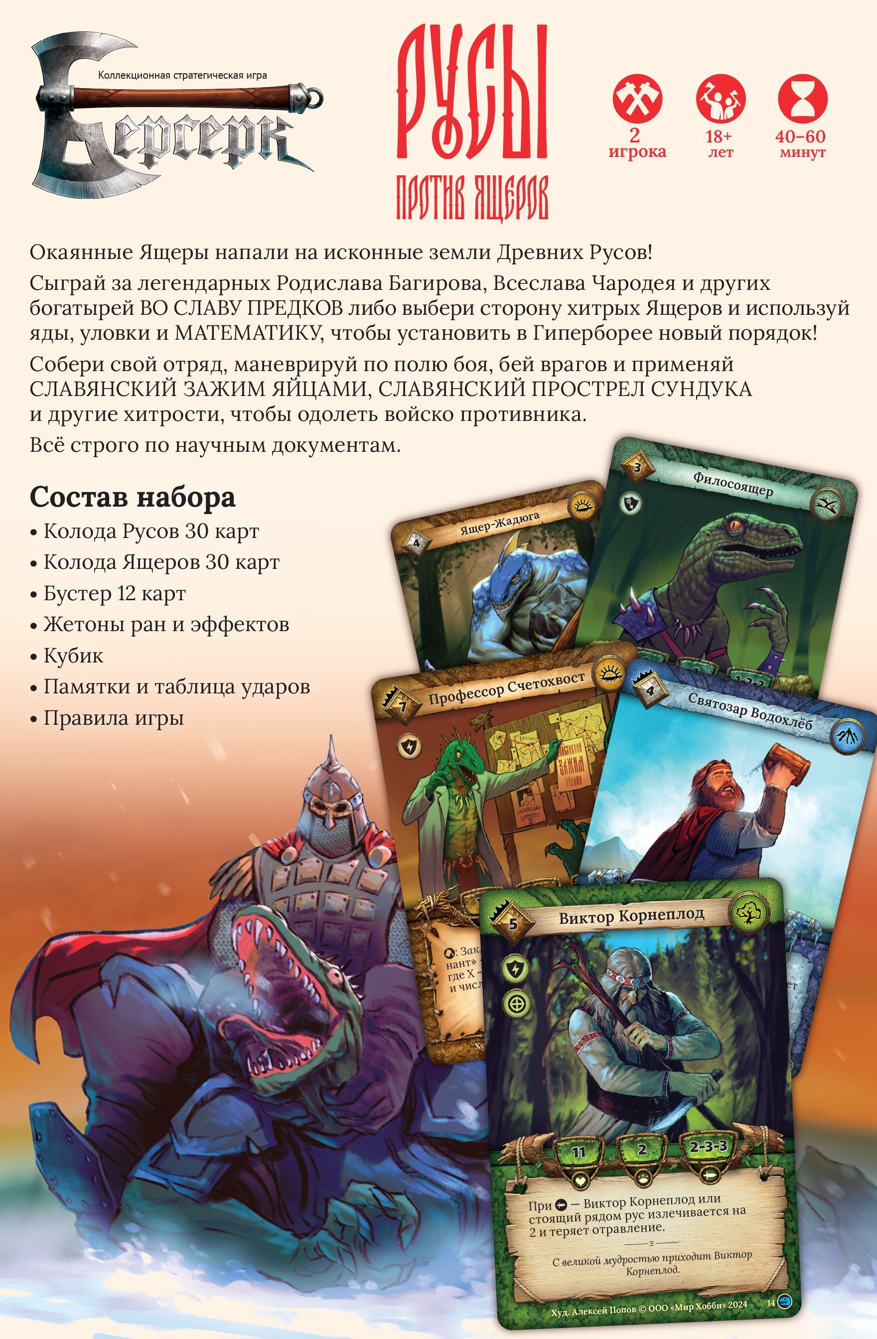 Братья Русы! Ящеры вероломные на землю нашу наступают! Хватайте меч-кладенец и дайте им отпор! Данный выпуск дуэльной игры основан на популярной компьютерной игре и предложит вам карточное противостояние. Применяйте карты с различными заклинаниями, существами и оружием, сражаясь друг с другом и стараясь уничтожить всех подручных соперника. Ящерам не победить!
