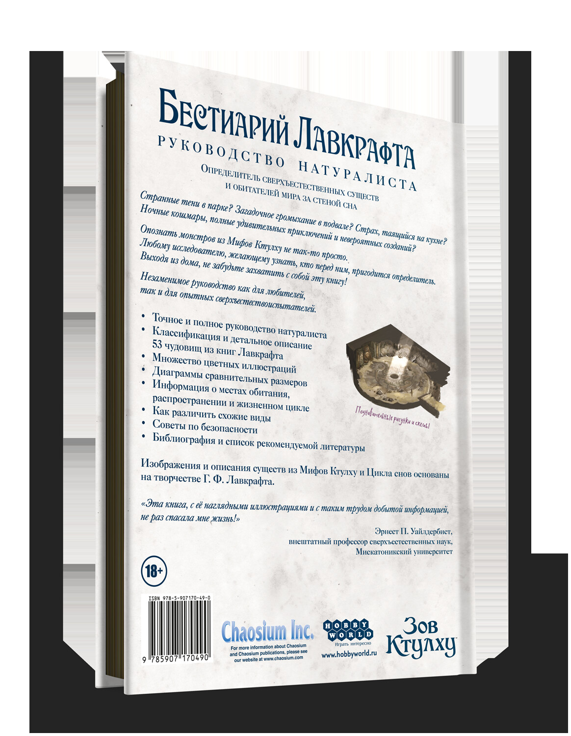 Внушительный массив данных о 53 лавкрафтовских чудовищахПолезные сведения о местах их обитания, образе жизни и повадкахСравнительные схемы размеров и характеристики существТочные иллюстрации чудовищ, которых невозможно сфотографироватьСоветы о том, как отличить одного монстра от другогоПравила и рекомендации начинающим исследователямВсеобъемлющие библиографии и перечень рекомендуемых книг