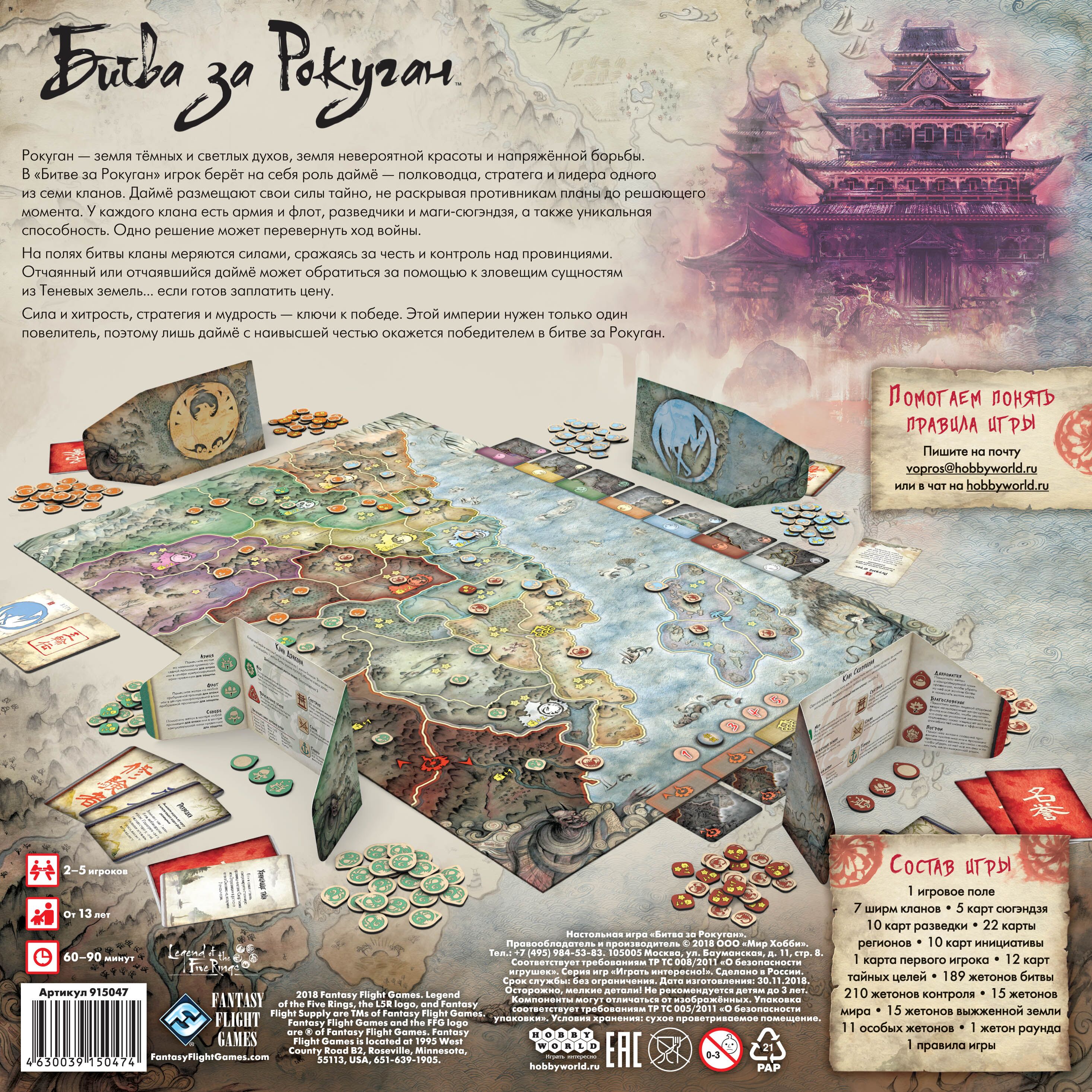 Рокуган – земля тёмных и светлых духов, земля невероятной красоты и напряжённой борьбы. В "Битве за Рокуган" игрок берёт на себя роль даймё – полководца, стратега и лидера одного из семи кланов. Даймё размещают свои силы тайно, не раскрывая противникам планы до решающего момента. У каждого клана есть армия и флот, разведчики и маги-сюгэндзя, а также уникальная способность. Одно решение может перевернуть ход войны. На полях битвы кланы меряются силами, сражаясь за честь и контроль над провинциями. Отчаянный или отчаявшийся даймё может обратиться за помощью к зловещим сущностям из Теневых земель… если готов заплатить цену. Сила и хитрость, стратегия и мудрость – ключи к победе. Этой империи нужен только один повелитель, поэтому лишь даймё с наивысшей честью окажется победителем в битве за Рокуган.