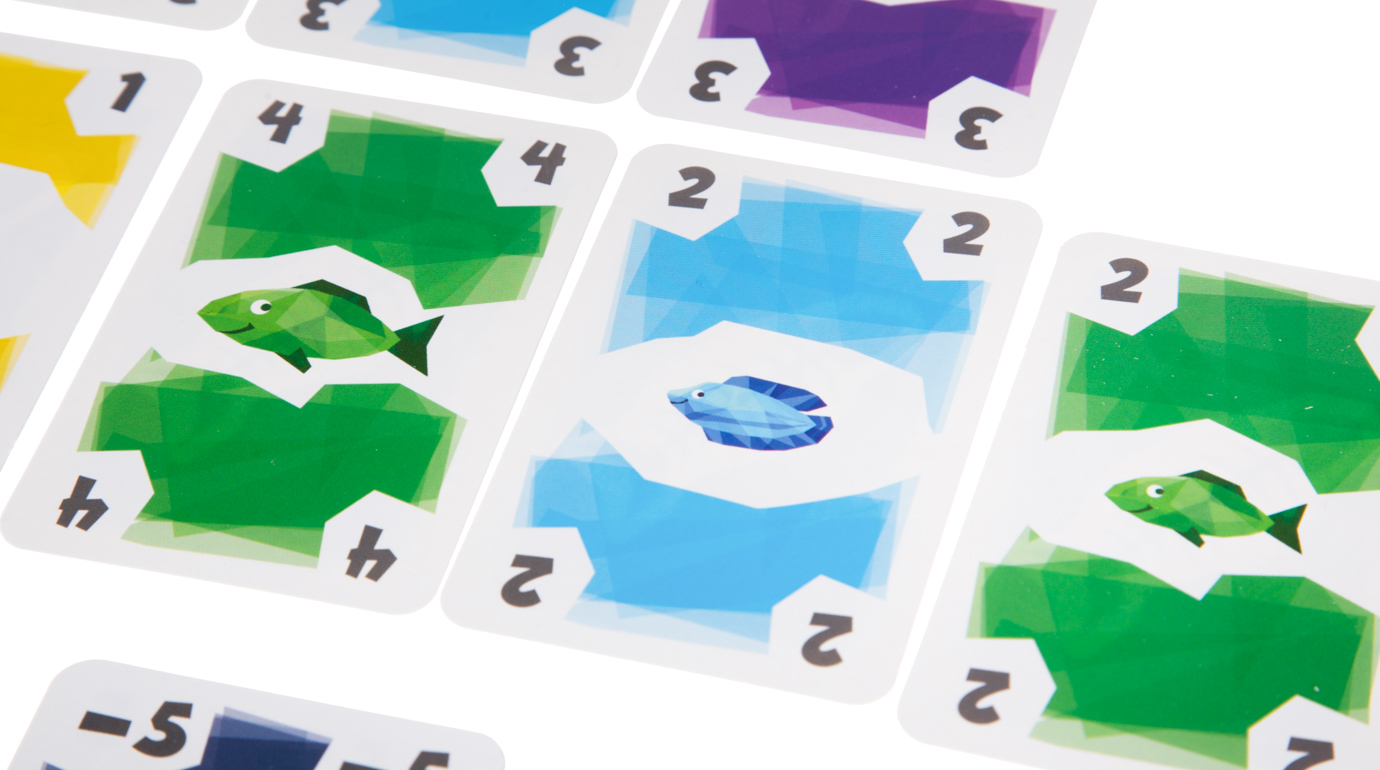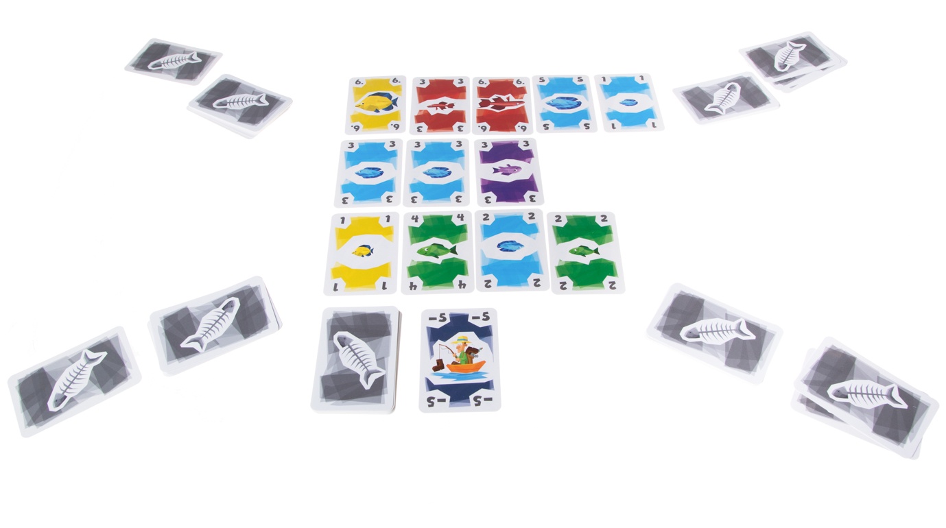 В настольной игре "Большой улов" игроки получают на руки пронумерованные карты с рыбами определенных цветов, а затем начинают формировать из них ряды. Цвет каждой сыгранной карты должен совпадать по цвету с самой правой картой в ряду. Как только в линии окажется пять карт, последний положивший забирает весь ряд себе, и затем распределяет эти карты в стопки положительных и отрицательных очков, в зависимости от того, сколько одинаковых рыбок в ряду было. Таким образом, как только все карты из личных колод игроков закончатся, произойдет подсчет победных очков. Не стоит забывать, что любому игроку светит неплохой бонус, если он выполнит по ходу игры определенное условие.