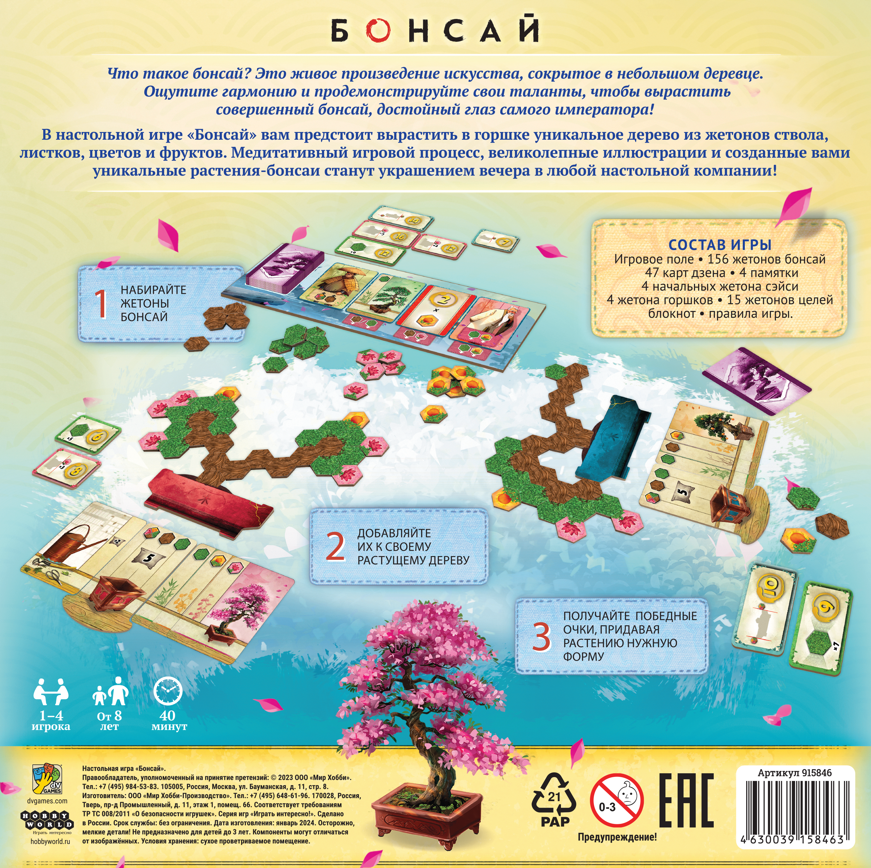 Игроков в данной игре ждет соревнование в попытке вырастить красивое миниатюрное дерево. Получив карты роста, целей и специальные жетоны, участники будут выращивать бонсай, не забывая периодически уделять время медитации, дабы получить новые карты. С помощью жетонов вы сможете придать своему дереву определенную форму, формируя ствол, крону и ветки. Разыгрывайте специальные карты, чтобы получить определенное преимущество и попробуйте одиночный режим. Как только колода карт роста подойдет к концу, участников ждет подсчет очков. Игрок, создавший самый большой и красивый бонсай, станет победителем!