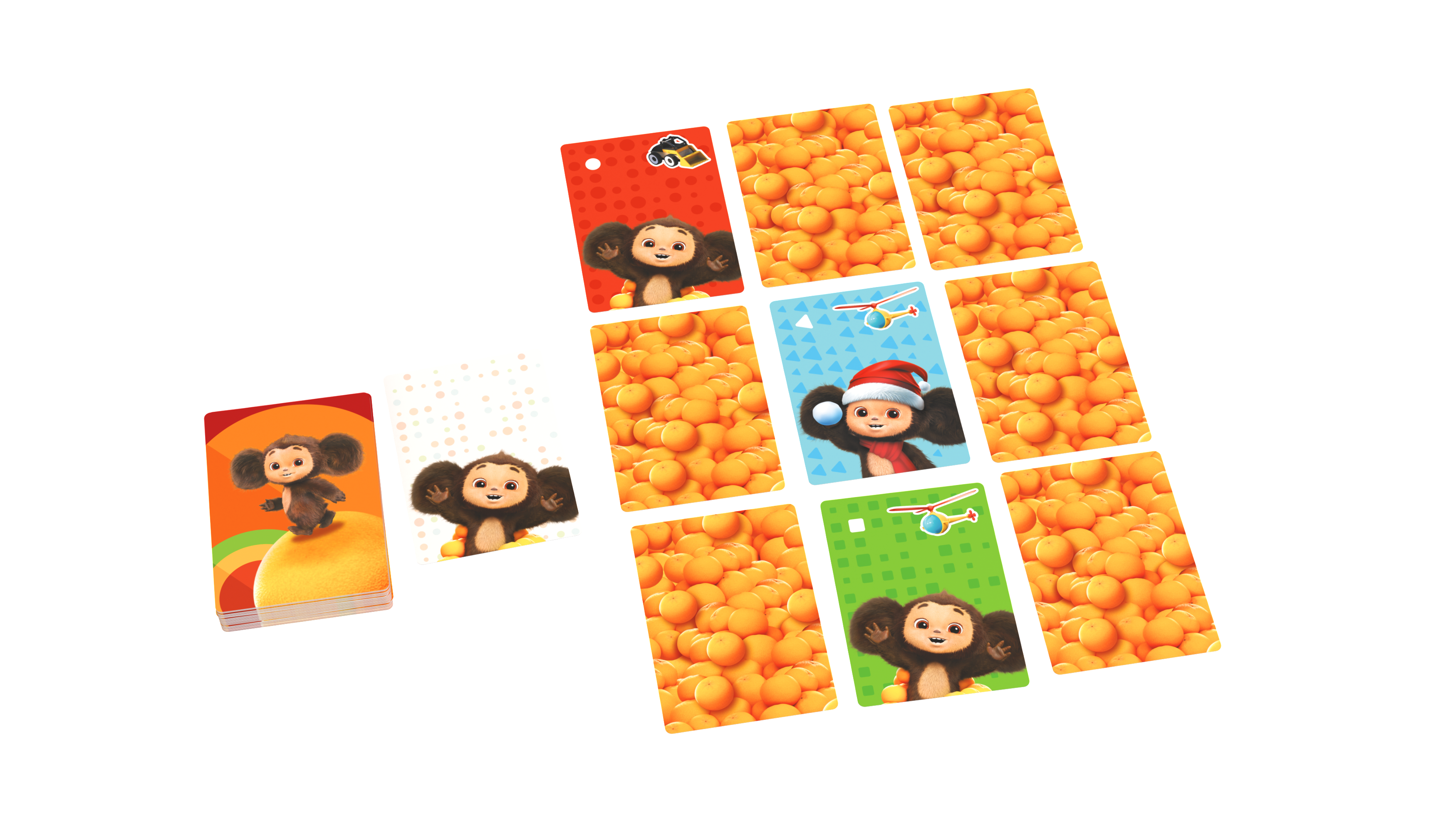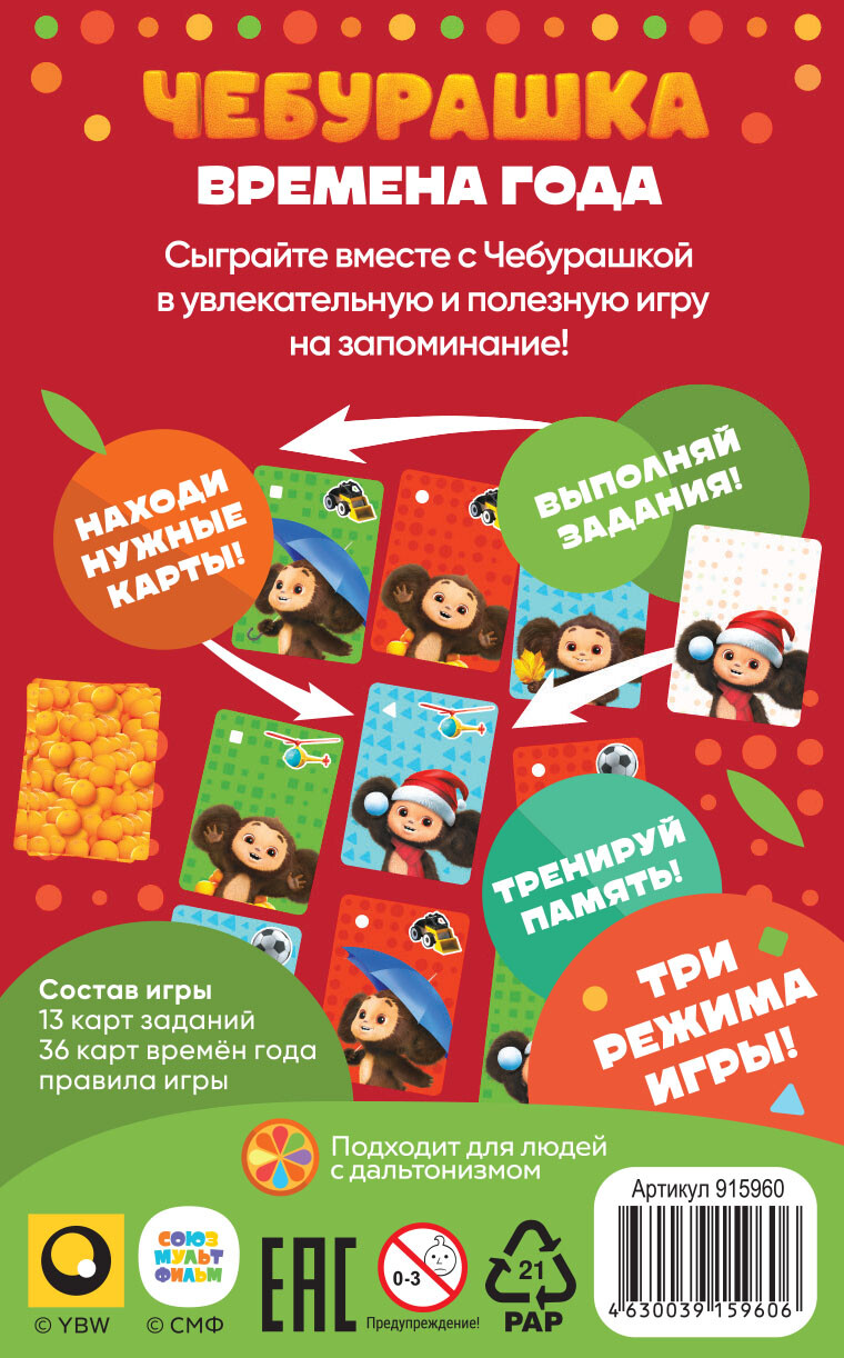 В коробке вы найдете различные карты с Чебурашкой и картами с изображением времен года. В игре вас ждет несколько режимов - игрокам предстоит выкладывать карты в закрытую, открывать их по одной и искать загаданный рисунок, причем в зависимости от режима это может быть как цвет фона, так и изображение ушастого персонажа. Тот, кто будет самым внимательным и заберет наибольшее количество карт себе, станет победителем!