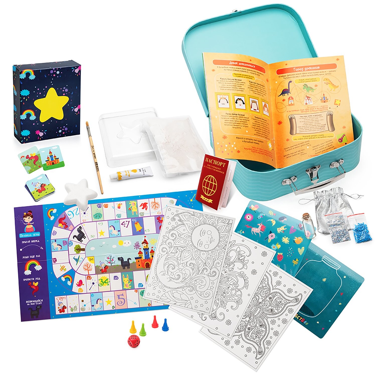 книжка-инструкция с заданиями, паспорт путешественника, игра-ходилка, фишки и кубик для игры, 30 карточек для игры в «Мемо», открытки-раскраски 3 шт., набор для создания поделки «Талисман», набор для создания «Звезды путешественника» из гипса, кисточка, акриловая краска, набор наклеек для украшения чемодана, тематические наклейки.