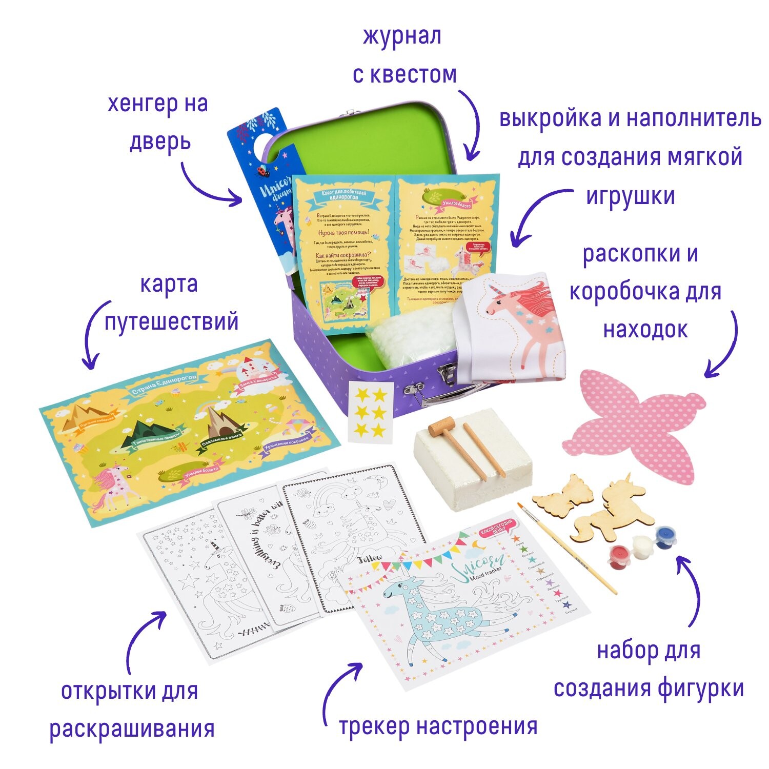буклет с описанием квеста, карта страны единорогов, набор для создания мягкой игрушки, набор для создания красочных открыток, набор для создания деревянного украшения для комнаты, набор для проведения раскопок, хенгер-раскраска на дверь, календарь настроения. Материал: текстиль, дерево, картон, бумага, пластик, гипс, синтетический наполнитель, керамика, краски