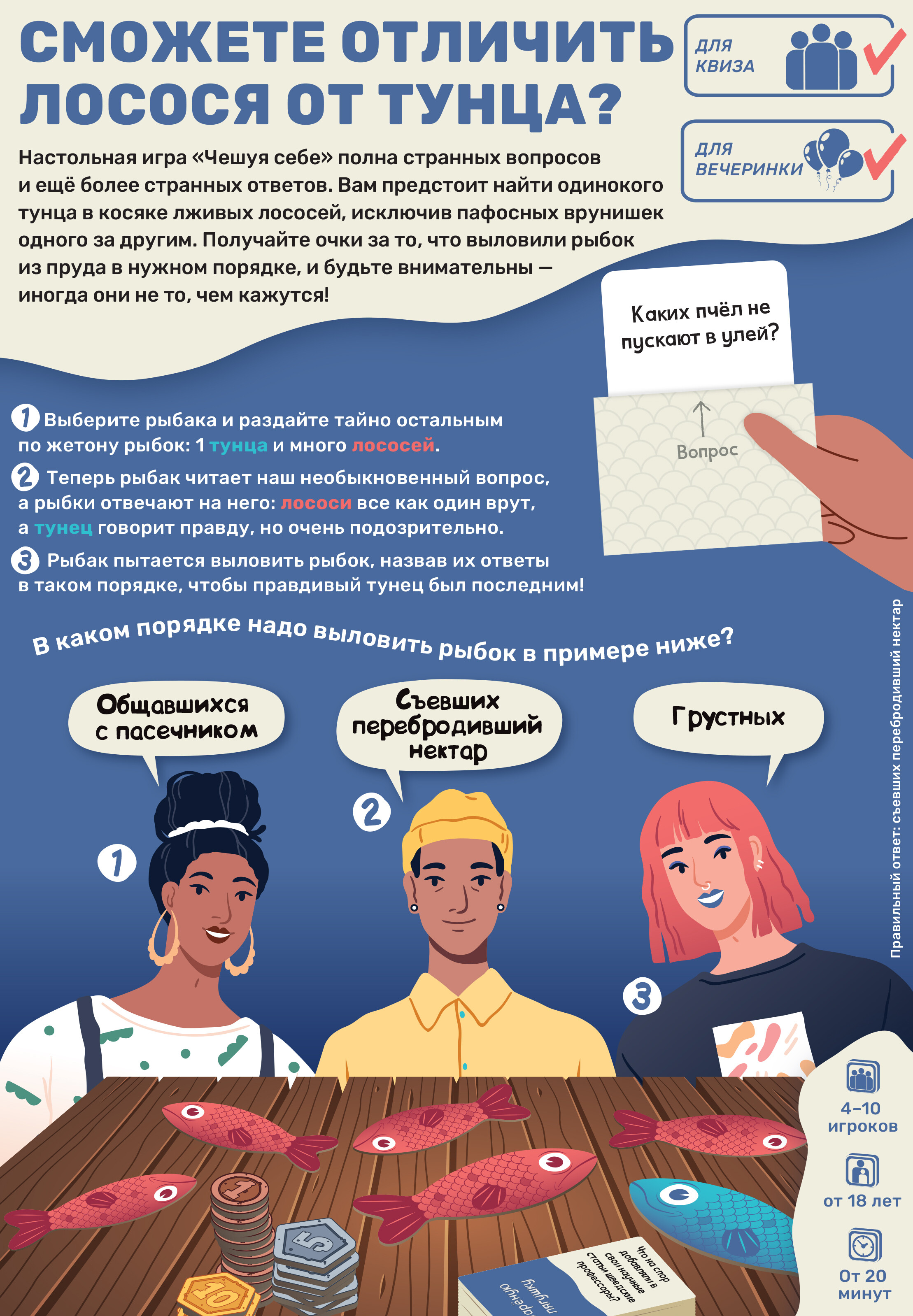 Один из игроков выступит в роли рыбака, а рыбами станут остальные участники. Процесс отлова будет происходить с помощью карт вопросов. Рыбак задаст вопрос, а игрокам необходимо будет ответить определенным образом, в зависимости от их роли. К примеру, тунец отвечает на вопрос честно, но подозрительно. Участнику в роли рыбака необходимо послушать все ответы и понять, кто именно является тунцом, назвав его последним. Если он все сделает правильно, улов засчитывается, а ход переходит к следующему рыбаку. Кто соберет самый большой улов, станет победителем!