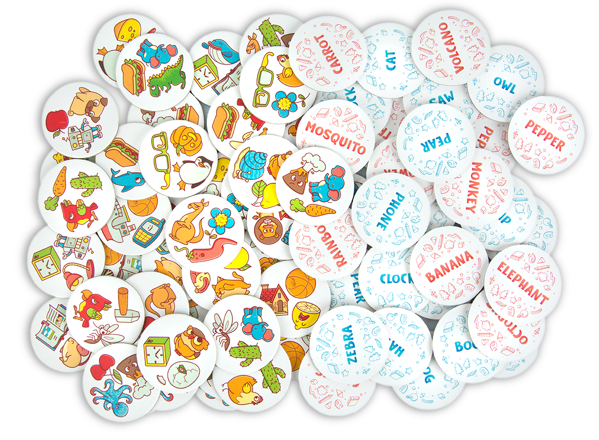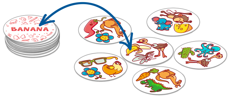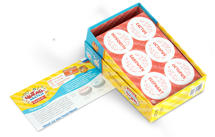 С данной игры юные игроки научатся быстро определять английские слова и проверят свою внимательность. В коробке вы найдете множество круглых двусторонних карт, на одной стороне которой будет слово, а на другой рисунки. Получив на руки начальную карту, игроки кладут остальные в центр стола изображениями вверх, после чего стараются отыскать соответствие слову среди рисунков и забрать эту карту себе. Игрок, который таким образом соберет наибольшее количество карт, станет победителем!