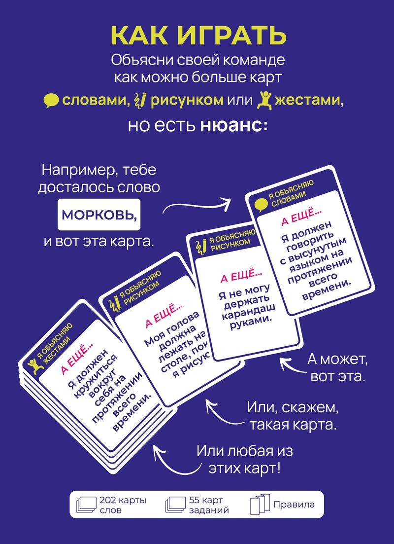 202 карты слов55 карт заданийПравила игрыРазмер карт: 44x67 мм (202 шт.)Размер карт: 63x89 мм (55 шт.)