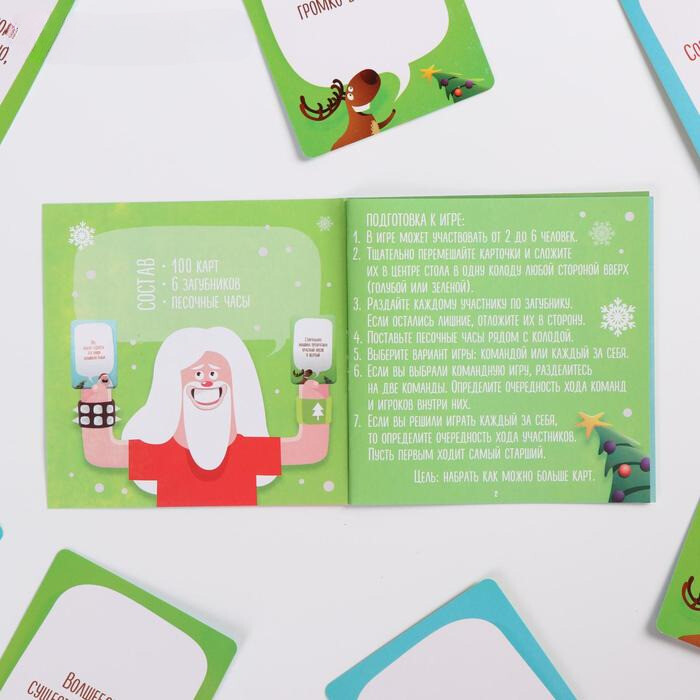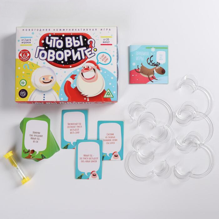 В коробке вы найдете множество карточек с выражениями и словами, в том числе на новогоднюю тематику, а также специальные загубники. Вставив такой загубник в рот, игроки произносят фразы с карт, а остальные пытаются угадать, что имеется ввиду. Кто отгадает, получит карту себе. Игрок, собравший наибольшее количество карт, станет победителем. Разнообразьте свой праздник!