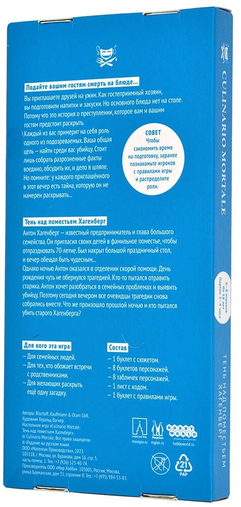 Когда хозяин поместья попадает в больницу с серьезным отравлением, каждый из гостей званого ужина становится подозреваемым. Кто же из присутствующих виновен? В новом выпуске настольного расследования каждый из игроков станет персонажем со своей предысторией и тайной. Общаясь друг с другом, участники постараются выведать максимум информации. Любые полученные сведения стоит воспринимать со скепсисом, ведь преступник постарается скрыться и замести свои следы.
