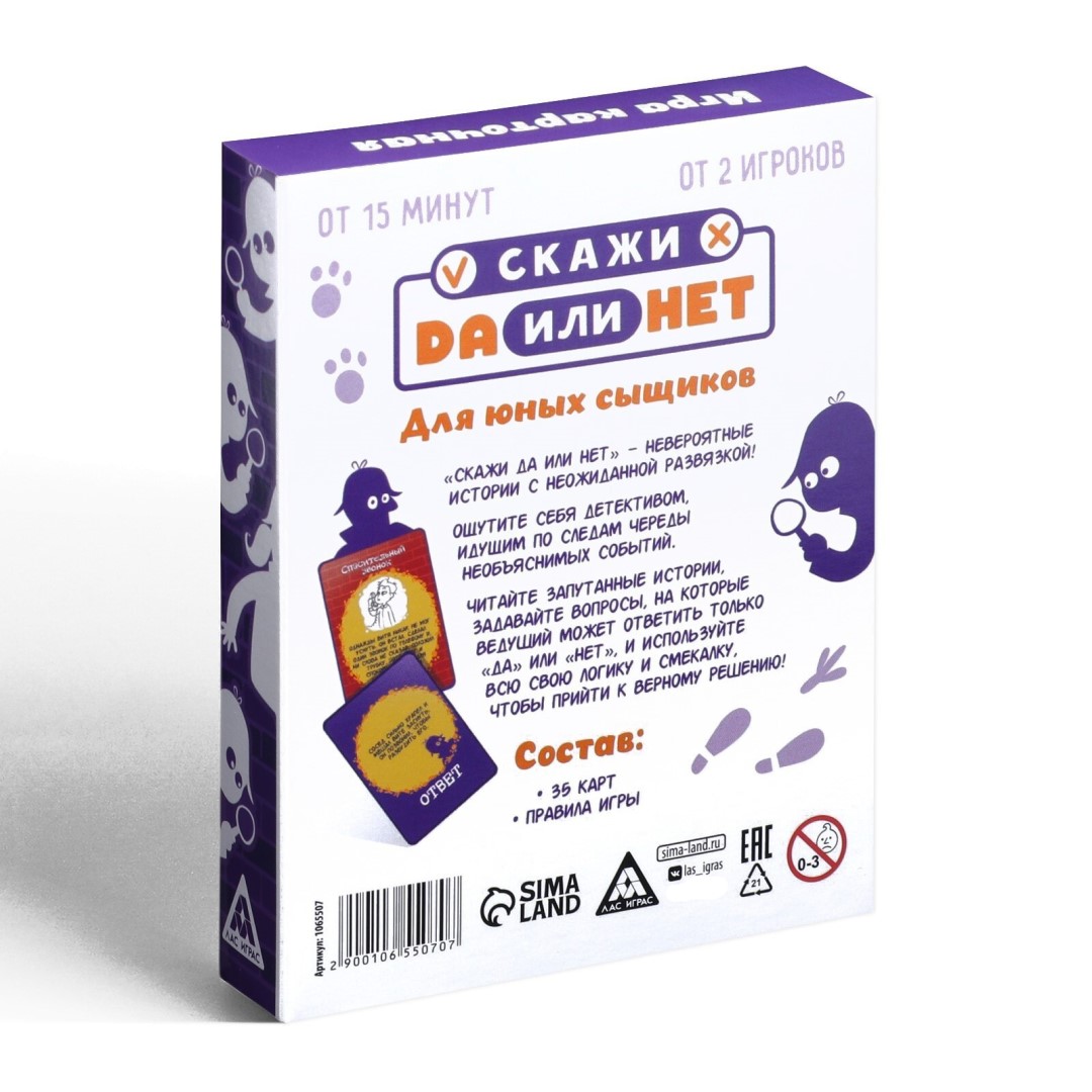 Юные сыщики, общий сбор! Попробуйте раскрыть все дела и докопаться до истины! В коробке вы найдете карты с различными необычными вопросами, небольшими историями, которые по очереди читает один игрок. Остальные участники пытаются догадаться, что имеется ввиду, и задают зачитывающему наводящие вопросы. Проблема в том, что ведущий может отвечать только "да" или "нет", а поэтому вам нужно дважды подумать, что именно спросить. Первый игрок, который догадается, получит победные очки. По итогу победит самый проницательный!