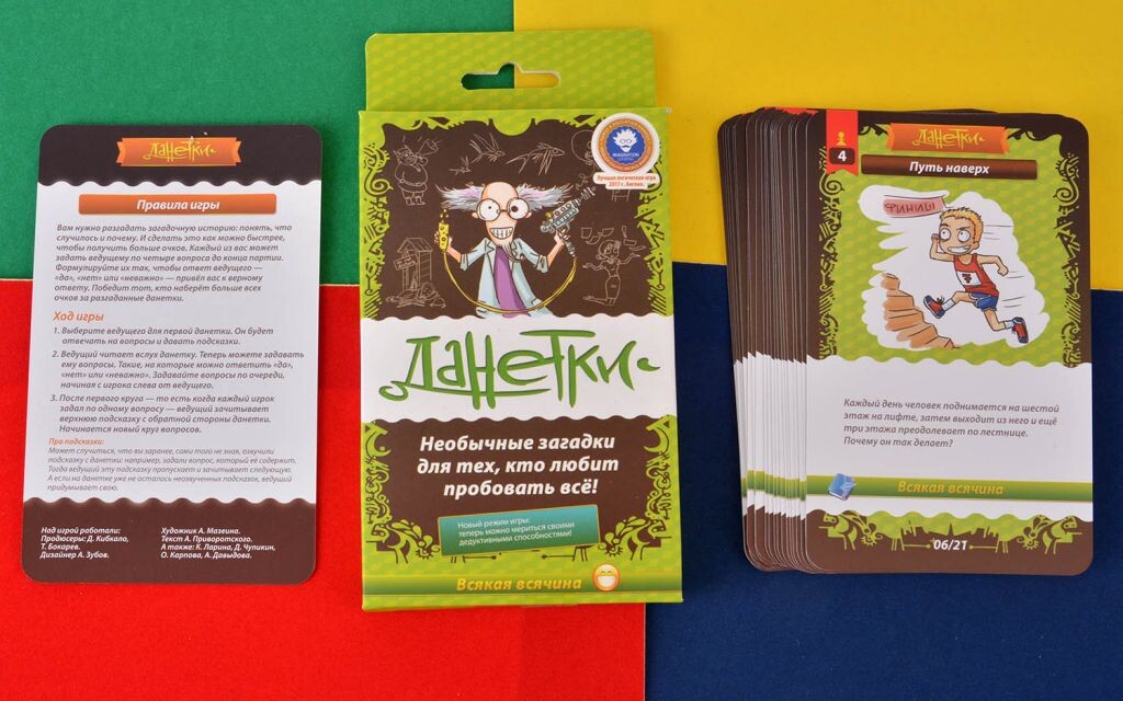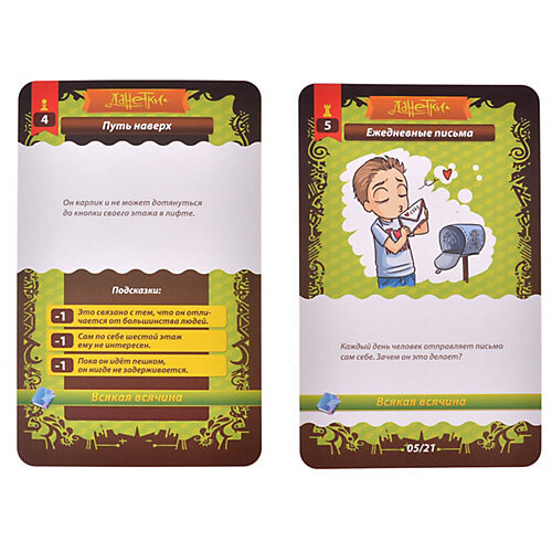 Внутри коробки "Данетки" вас ждет 21 история, в которой есть некая тайна. Один из игроков читает текст с карты, а остальным нужно понять, что имелось ввиду. Задавая вопросы ведущему, участники соревнуются в скорости и эрудиции. Но отвечать ведущий может только "да" или "нет", поэтому следует подбирать вопросы правильно. Ну что, готовы проявить чудеса дедукции.