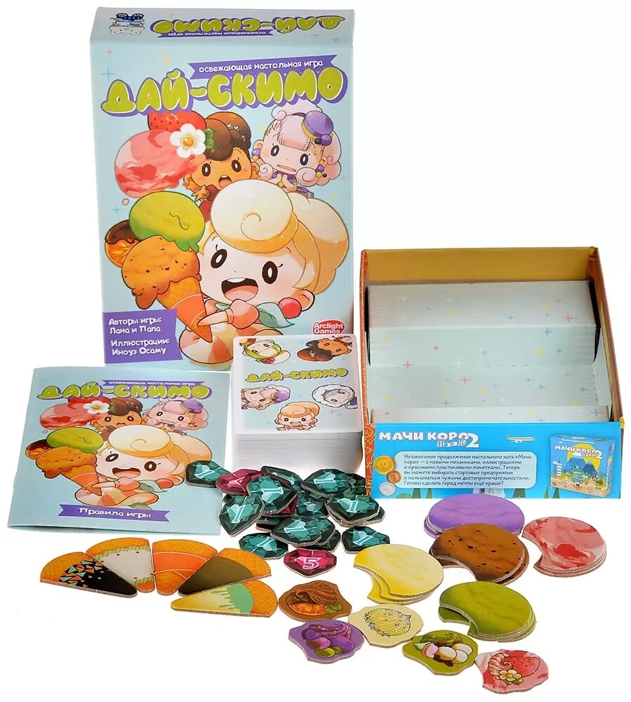 65 карт5 жетонов топпингов5 жетонов рожков15 жетонов мороженого25 жетонов счастьяПравила игрыРазмер карт: 56x87 мм (65 шт.)