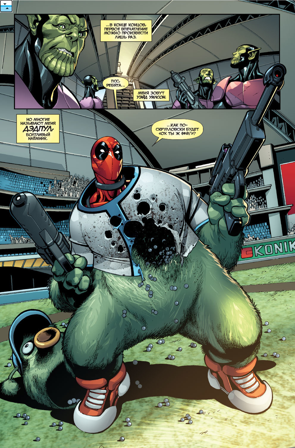 Пришельцы, умеющие менять облик и помешанные на захвате миров, проникли в правительство, промышленность и даже в команды супергероев. Но они не были готовы к встрече с Дэдпулом! Обладающий даром исцеления, который делает его практически неубиваемым, Уэйд Уилсон – это самый безумный наёмник, бодро шагающий по вселенной Marvel, раздавая пинки направо и налево. С остроумными шутками и огнестрельным оружием наперевес этот человек-армия в одиночку спасает целый стадион невинных людей от нападения скруллов. А потом, ко всеобщему удивлению, он сдаётся.