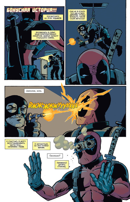 Здесь мы тебе этого не расскажем, лоботряс! Прочитай книгу, чтобы узнать, кто восстал из прошлого Дэдпула, чтобы надрать ему задницу, и как Дэдпул нашёл себе постоянную работу! Без шуток.