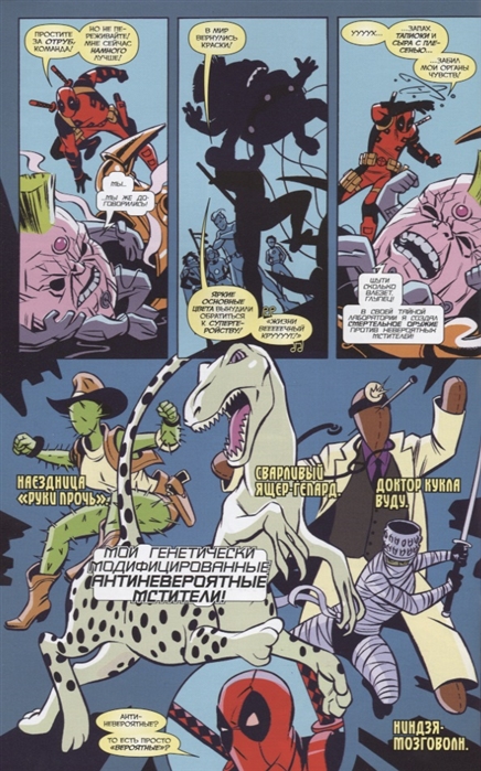 Так вот, это совсем другой случай. Автор сценария Каллен Банн ихудожник Далибор Таладжич — создатели первого мясорубофеста— воссоединились, чтобы рассказать новую историю о смерти и разрушении, где главная роль досталась болтливому наёмнику! И Уэйд Уилсон в этом сюжете выносит всех ваших любимчиков самыми страшными способами! В ролях: ГВЕНПУЛ! ЛУННЫЙ РЫЦАРЬ! МИСС МАРВЕЛ! СТРАЖИ ГАЛАКТИКИ! ДАЖЕ ЛУННАЯ ДЕВОЧКА И ДИНОДЬЯВОЛ! Ему будет куда больнее, чем вам, — но вам это понравится! Одно известно точно — вы не поверите глазам, когда дэдпул уничтожит всю вселенную Marvel… ОПЯТЬ!
