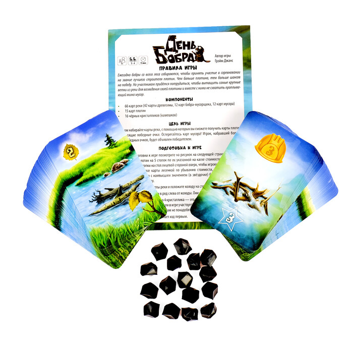 66 карт реки (42 карты древесины, 12 карт бобров-мусорщиков, 12 карт мусора), 15 карт плотины, 16 черных кристалликов (камешков), правила игры.