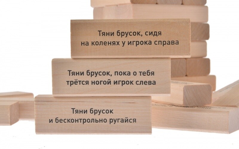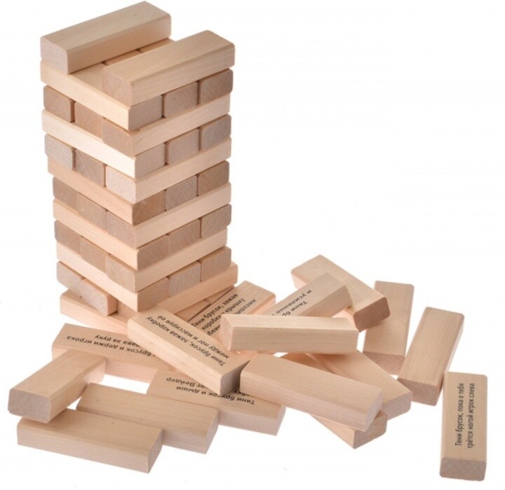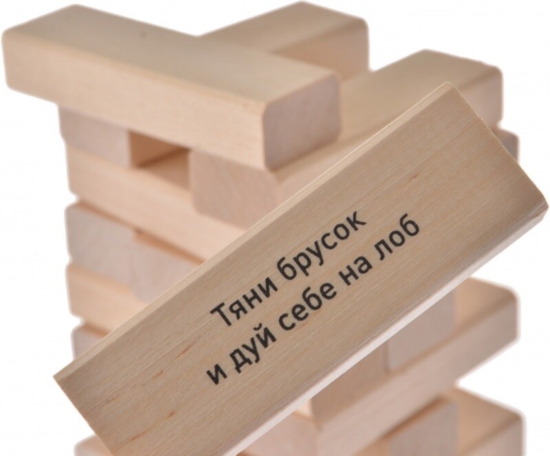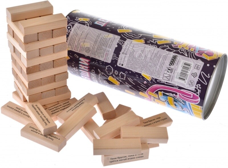 Собирайтесь большой компанией и посоревнуйтесь в веселой игре! В упаковке вас ждут деревянные блоки, из которых нужно выстроить башню, выкладывая элементы один на другой по три в ряд. После этого каждый из участников по очереди вытаскивает любую деревянную деталь одной рукой и ставит ее наверх башни. При этом, на многих брусках есть разные веселые задания для вечеринки. Главное - не торопиться, ведь чем дольше идет партия, тем более шаткой становится башня. Кто уронит всю конструкцию, победы не получит! А кто был самым аккуратным и не торопился, тот и заслужил статус победителя. Детали упакованы в удобную прочную коробку, благодаря которой игру легко можно взять с собой в дорогу.