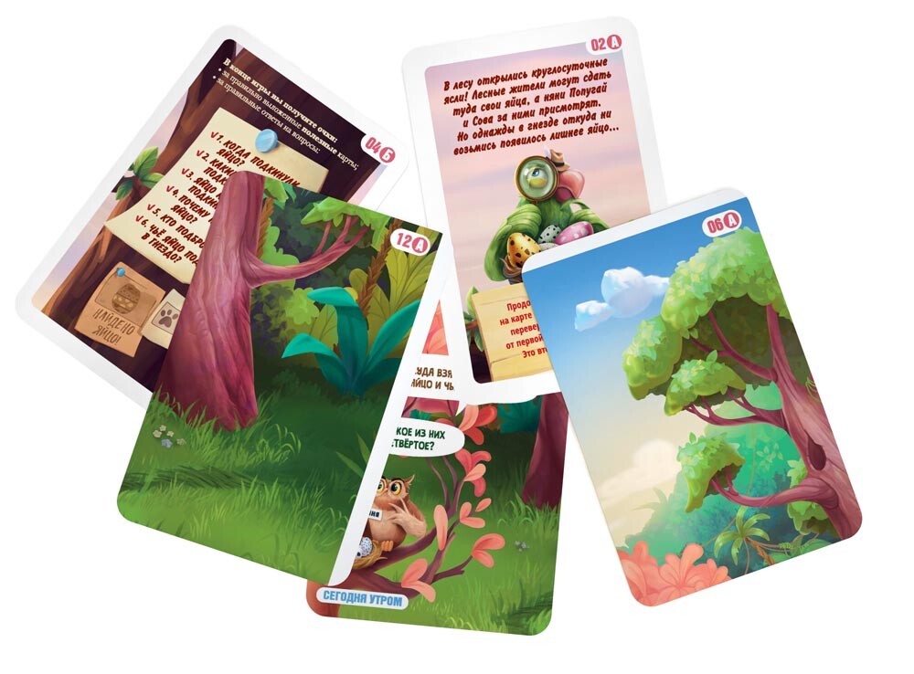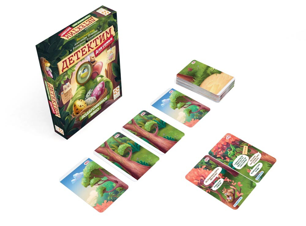 Кто подбросил в гнездо новое яйцо? Собирайтесь всей семьей и дружно постарайтесь найти ответ на этот вопрос! Действуя сообща, открывайте карты и решайте, важная ли информация на них нарисована. Если игроки считают, что та или иная карта поможет в расследовании, кладите ее на стол одна к другой, стараясь собрать полную картину произошедшего. В конце игры вам нужно будет ответить на несколько вопросов, ориентируясь на открытые карты. Если у игроков получится найти ответы на все вопросы, они станут лучшими детективами и победителями!
