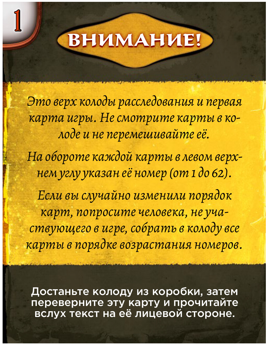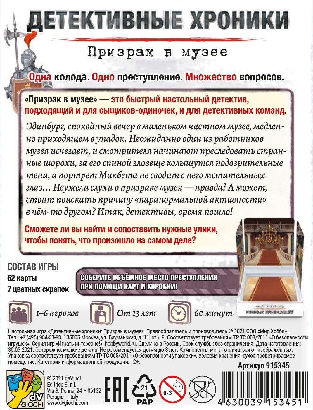 Детективы, для вас новое задание! В таинственном музее происходят поистине загадочные события. Помимо прочего, пропадает один из работников, и теперь вам предстоит выяснить, является ли все это проделками потусторонних сил, или правда куда прозаичнее. В роли детективов вам предстоит действовать сообща, сопоставлять улики, строить догадки и сбрасывать с руки карты с ненужными, на ваш взгляд, обстоятельствами ситуации. В конце партии игроки ответят на контрольные вопросы, и ответы эти покажут, смогли ли вы распутать дело. Вы же не боитесь привидений? Тогда вперед, докажите, что вы лучшие сыщики!
