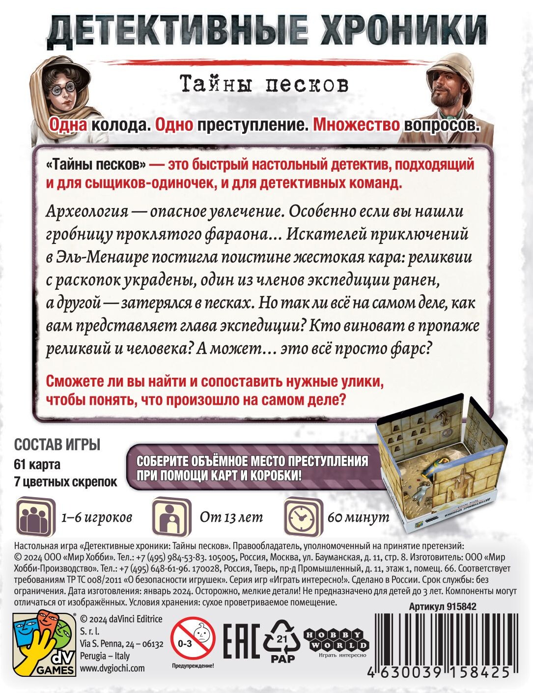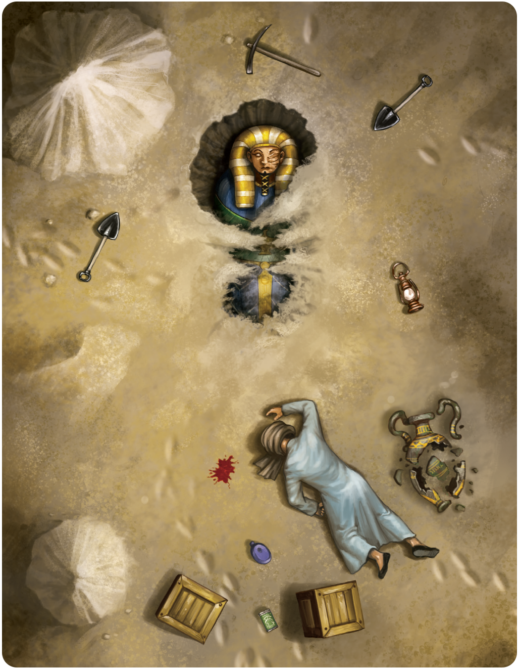 Бескрайние пески хранят множество секретов. И множество опасностей... Отправившись в экспедицию, вы попадаете в ряд неприятных ситуаций. Гиды говорят, что это проклятие, но вы не столь уверены в сверхъестественных силах. Скорее всего, в экспедиции есть тот, кто все саботирует. Получится ли у вас вычислить преступника? Действуйте сообща, собирайте улики и анализируйте полученную информацию. Только вам под силу разобраться в том, что происходит. Докажите, что вы настоящие детективы и раскройте тайны песков!