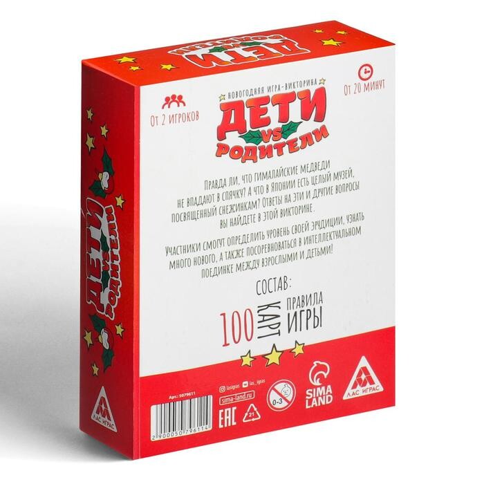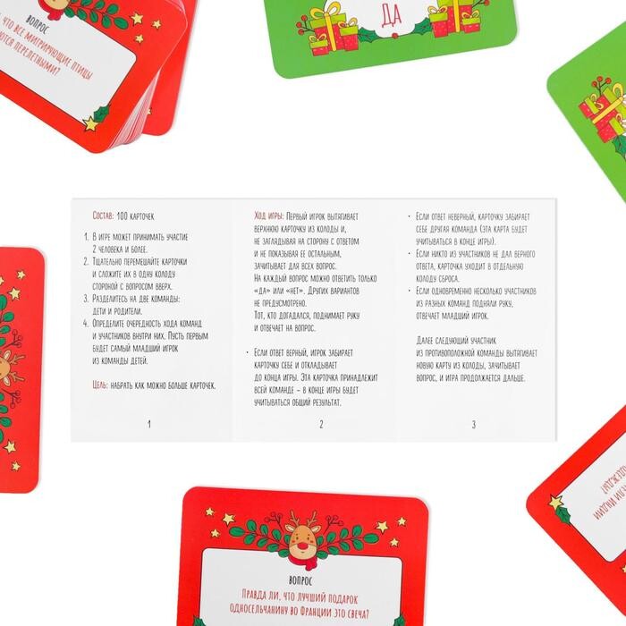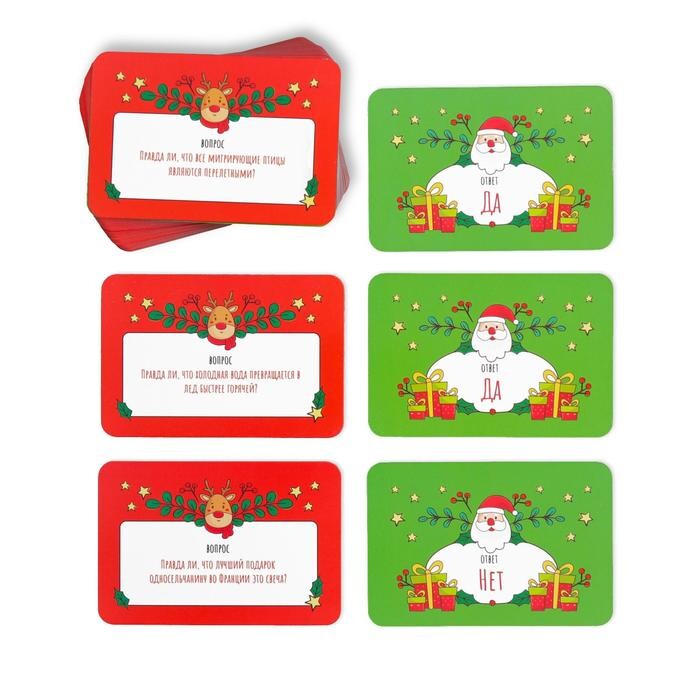 Веселая викторина в новогоднем антураже предложит игрокам поделиться на команды детей и взрослых, и посоревноваться в своих знаниях. Доставая карты из колоды, игрок будет зачитывать вопрос, а остальные постараются дать правильный ответ. Команда, ответившая правильно, получит карту себе. В случае неудачи карта перейдет другой команде.