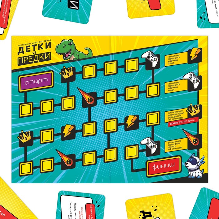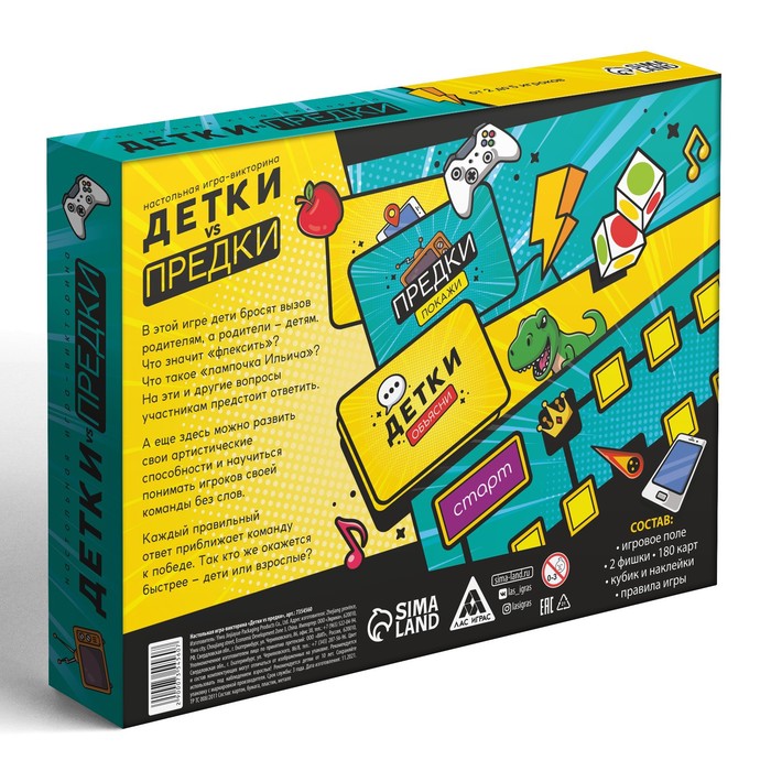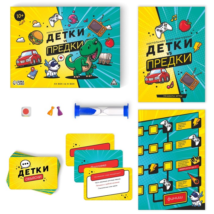 В этой викторине игрокам предстоит отгадывать слова из разных поколений. Смогут ли взрослые понять, на каком языке сейчас говорят дети и подростки? Сможет ли молодое поколение угадать слова, которыми общаются их родители? Выложив на стол большое поле, игроки делятся на команды, кидают кубик и объясняют слова с карточек несколькими способами - показывают, объясняют, или угадывают из нескольких вариантов. Делать это нужно быстро, поскольку в игре есть песочные часы. Команда, отгадавшая слово, двигается по полю. Кто первым доберется до финиша, станет победителем!