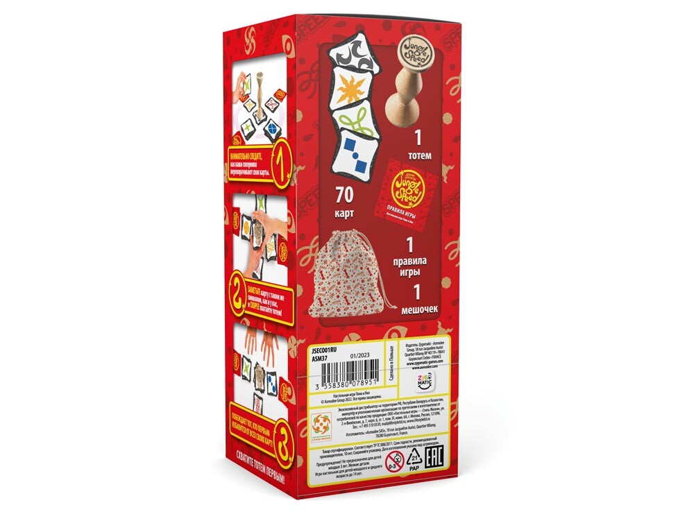 Вас ждет веселое соревнование, в котором основными критериями станут внимательность и скорость реакции. Поставьте в центр стола деревянный трофей и раздайте всем участникам разноцветные карты с разными символами. Главной задачей игроков станет избавиться от всех карт на руках раньше остальных. Открывая карты одновременно, участники внимательно следят за обстановкой на игровом столе. Ведь если символы на картах хотя бы у двух участников совпадут, нужно будет как можно быстрее схватить тотем. Если у вас получится это сделать, вы станете на шаг ближе к победе. Но если вы схватите тотем по ошибке, то будете оштрафованы!