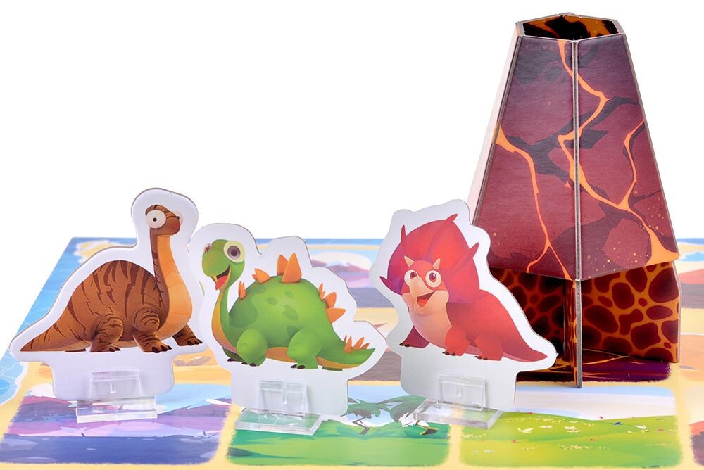 О нет, извержение вулкана! Динозаврам надо поспешить, чтобы спастись! В данной кооперативной настольной игры участники возьмут на себя роль милых динозавриков, которым предстоит бежать от надвигающейся лавы. При помощи броска кубика вы сможете перемещаться по полю, стараясь встретиться в определенной части острова. Если на кубике выпадет изображение лавы, вам нужно будет кинуть кристалл на поле, и там, где он приземлится, появится лава. По лаве ходить нельзя, как и находиться с другим динозавром на одной клетке Ставки высоки, как никогда, но это же вас не остановит? Будьте храбрыми и успейте спастись с разрушающегося острова!