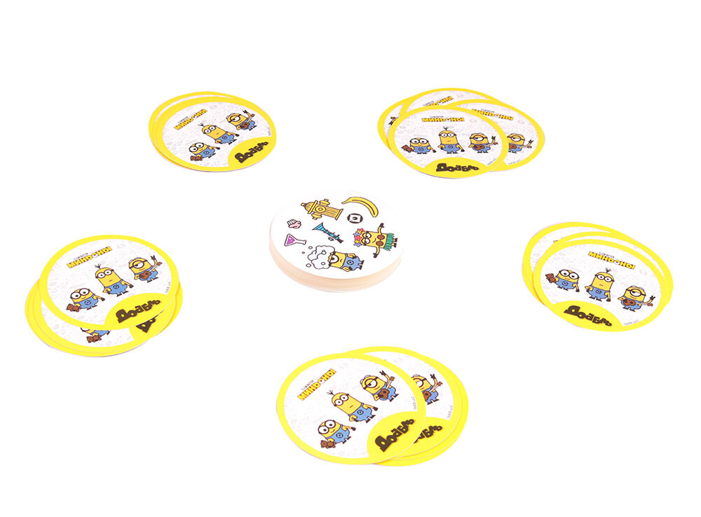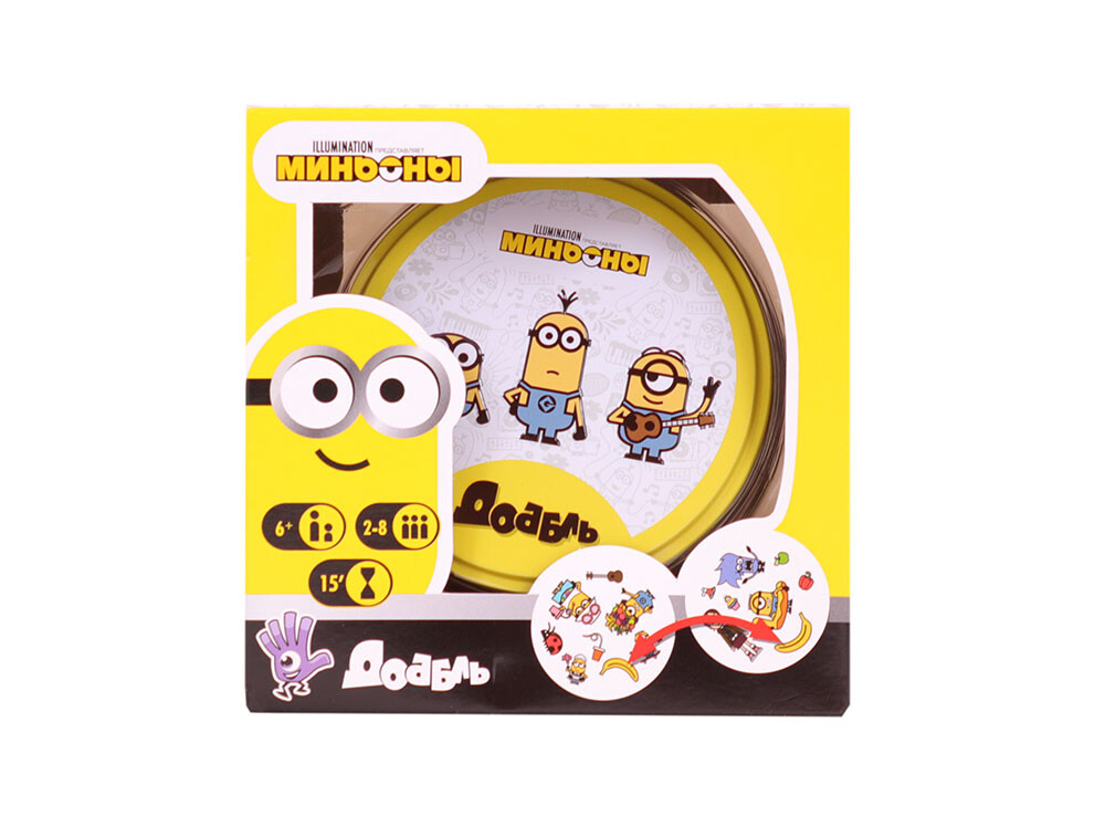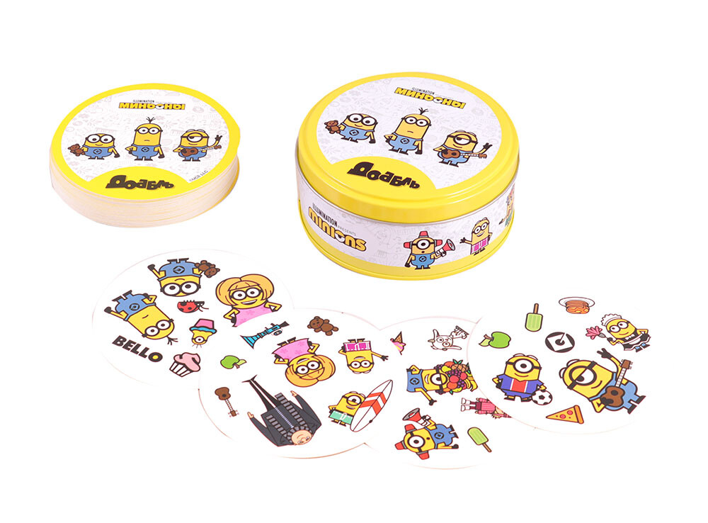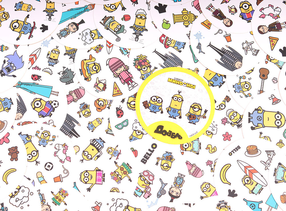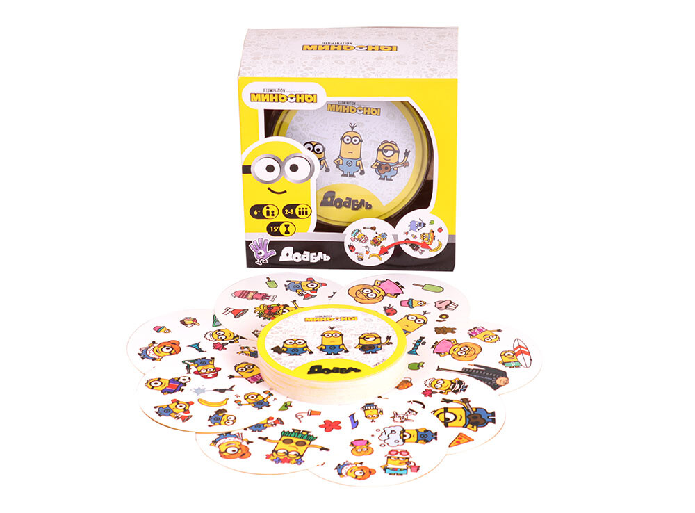 На сей раз они добрались и до карточной игры "Доббль", заменив все рисунки своим желтым ликом. Правила, при этом, остались неизменны - получив карты на руки, игроки выкладывают закрытую колоду в центр стола и открывают по одной карте из нее. Если какая-либо из иллюстраций совпадает с рисунком на карте в руках, эту карту нужно сбросить. Причем, все играют одновременно, поэтому времени на раздумья нет, победит самый быстрый и внимательный!