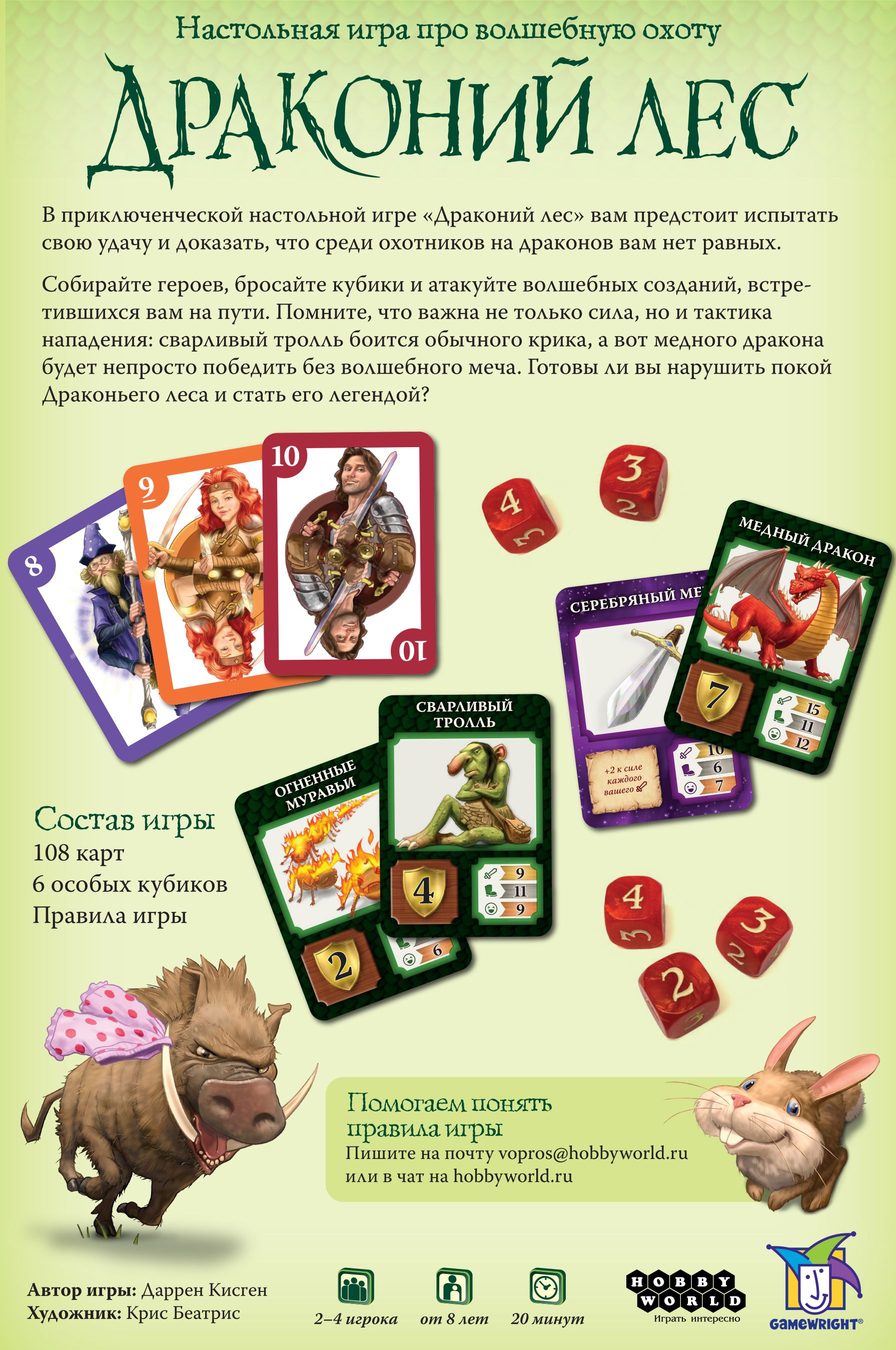 Добро пожаловать в Драконий лес! Отважные герои готовы сразиться с драконами, и им не помешает ваша помощь. Разложите карты леса, сформировав небольшую территорию, после чего отправляйтесь навстречу приключениям. В свой ход игроки могут атаковать несколькими способами выбранный объект с помощью комбинации карт, либо воспользоваться подмогой. Бросок кубиков определит, удалось ли вам победить, или же бравому герою придется отступить. При победе карта существа отправится к игроку, что приблизит его к победе. Не стоит забывать и о картах событий - они действуют на всех игроков одновременно и вносят определенные изменения в игровой процесс. Кто победит больше драконов? Хватайте меч и окажитесь лицом к лицу перед огнедышащими созданиями!