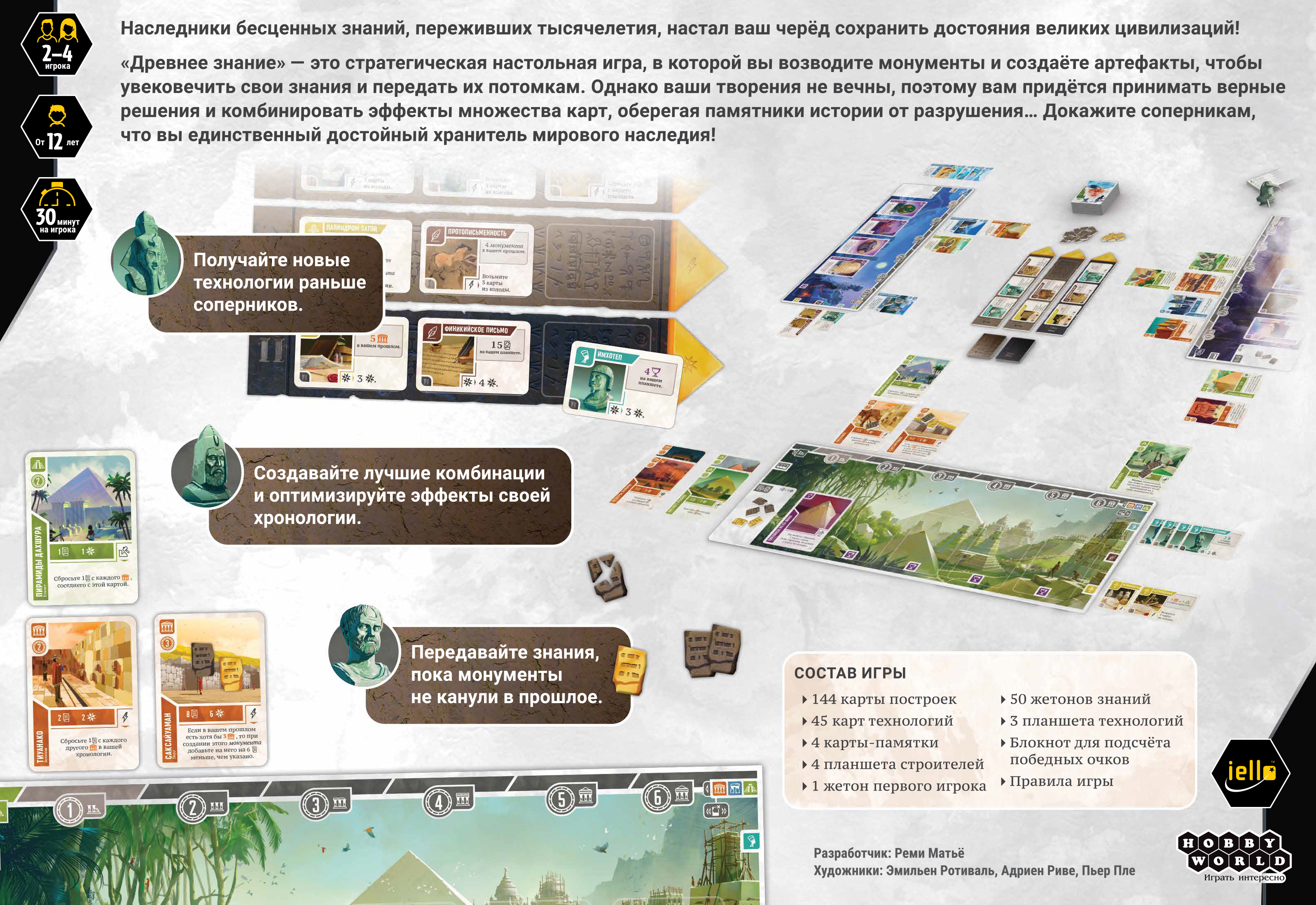 В данной необычной и красочно оформленной стратегической игре вашей задачей станет возведение монументов для потомков. Время в игре беспощадно, и для того, чтобы строения не разрушились и остались спустя века, игрокам нужно будет грамотно расходовать свои карты. Когда монумент канет в лету, участники смогут воспользоваться специальными картами и вернуть свою постройку, если она была весьма ценна. Помимо этого, в игре будет доступно и развитие технологий, что даст вам мгновенный положительный эффект. Грамотные комбинации карт и технологий принесут вам победные жетоны. Соберите наибольшее количество древних знаний и станьте победителем!