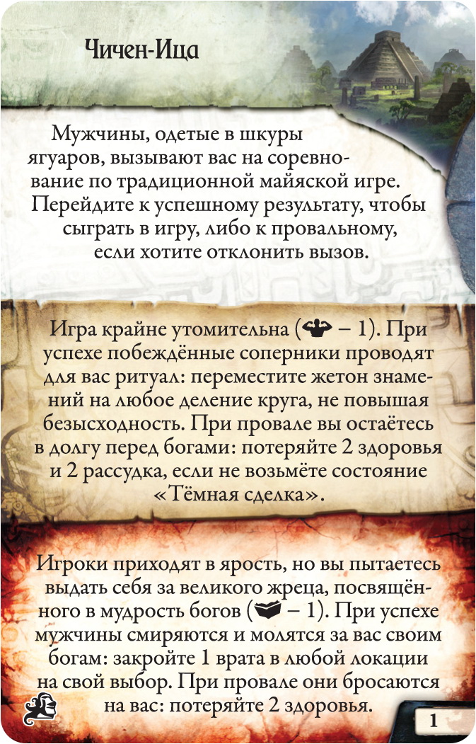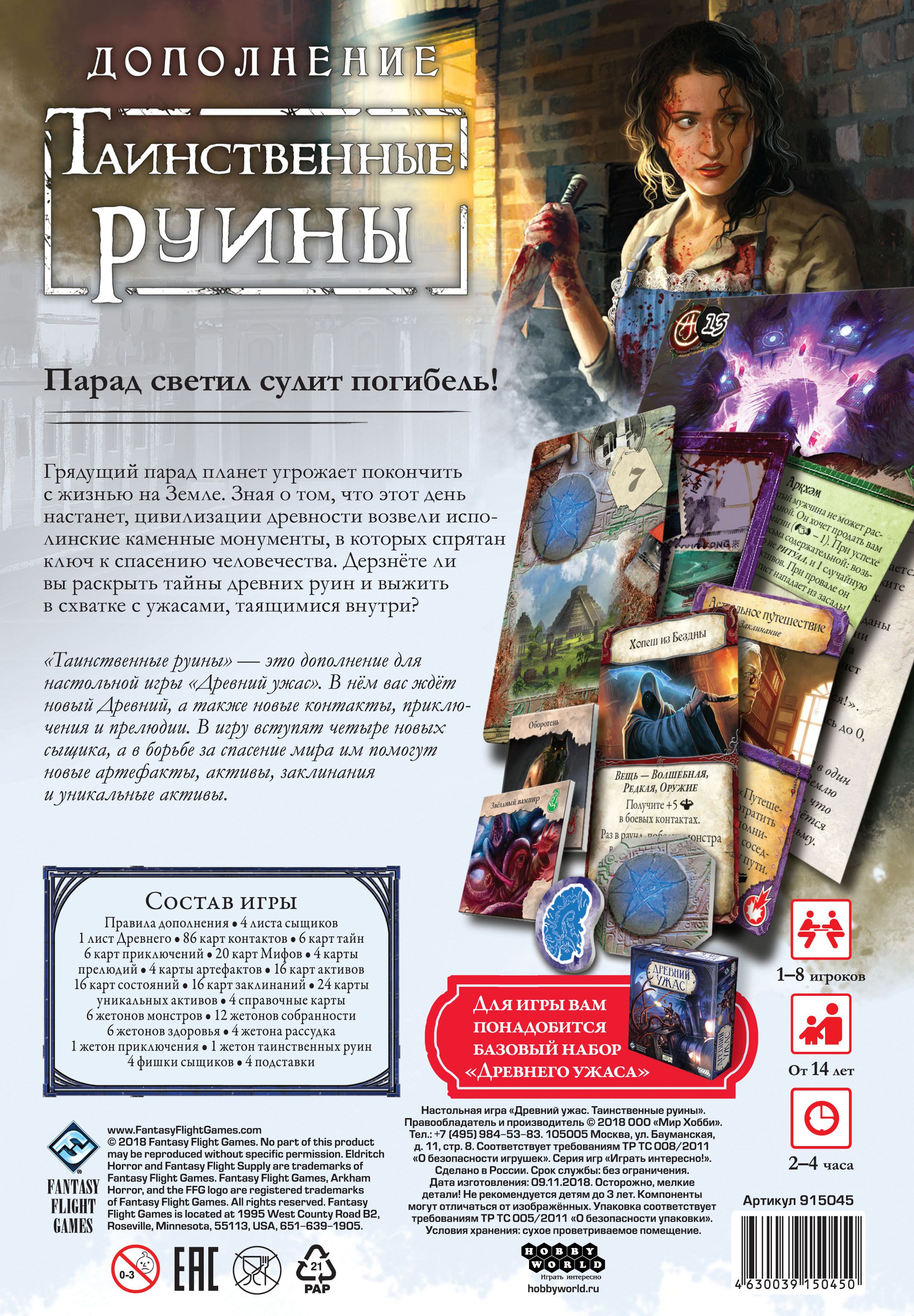 Есть легенда, что в руинах загадочных сооружений спрятана информация о спасении мира от глобальной угрозы. Бравым сыщикам предстоит воспользоваться данной возможностью и отправиться на исследование данных мест! В новом дополнении для настольного хита "Древний Ужас" игроки вступают в гонку со временем, пока Луна, Солнце и Земля не выстроятся в один ряд. Ведь тогда древнее пророчество будет исполнено, появится Темный бог и всему придет погибель. Новые персонажи, карты приключений с побочными сюжетными линиями, новые артефакты и заклинания, а также возможность переброски кубиков ждут вас в этом расширении. Откройте знаменитую игру с новой стороны! *Это не самостоятельная игра. Вам понадобится базовый набор игры "Древний Ужас".