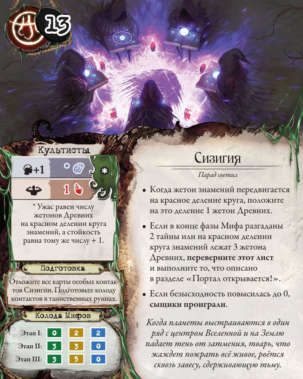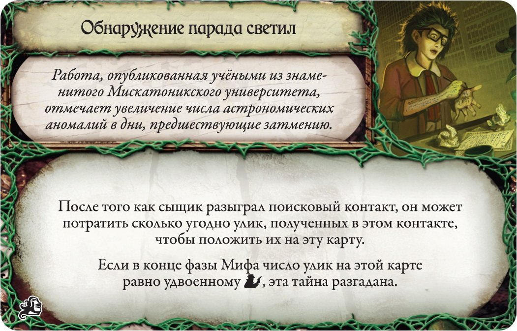 В новом дополнении для настольного хита "Древний Ужас" игроки вступают в гонку со временем, пока Луна, Солнце и Земля не выстроятся в один ряд. Ведь тогда древнее пророчество будет исполнено, появится Темный бог и всему придет погибель. Новые персонажи, карты приключений с побочными сюжетными линиями, новые артефакты и заклинания, а также возможность переброски кубиков ждут вас в этом расширении. Откройте знаменитую игру с новой стороны!