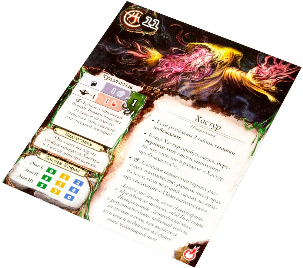 Дополнение к настольному хиту "Древний ужас" включает в себя новых сыщиков, монстров, карты заклинаний и артефактов, и, конечно, новый Древний - Хастур, распространяющий безумие по всей земле. Так же в коробке игроков ждут новые игровые механики: долгосрочное ухудшение навыков, двустронние карты, обладающие уникальными эффектами, и карты Прелюдий, которые выбираются случайным образом в начале партии и внесут еще большее разнообразие в игру. Преодолейте все препятствия, сохраните рассудок и остановите вторжения темных сил в наш мир!