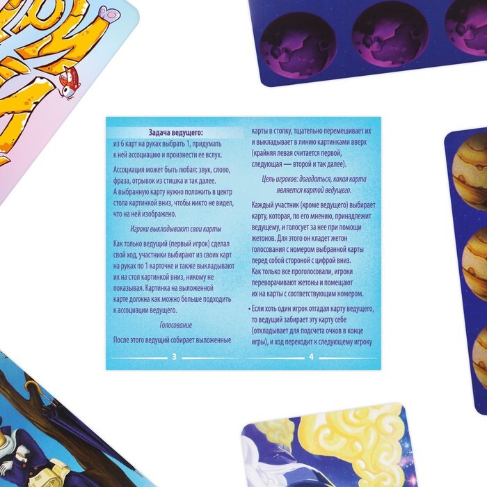 Перед вами красочная игра на ассоциации, которая подойдет для юных игроков и их родителей. Задача проста, но увлекательная, - каждый из игроков становится ведущим по очереди, и в свой ход выкладывает карту, загадывая к ней ассоциацию. Остальные игроки из своих карт выбирают наиболее подходящую под то, что сказал ведущий, а затем все эти карты перемешиваются, и открываются. Кто сможет отгадать самую первую загаданную карту, тот получит ее себе.