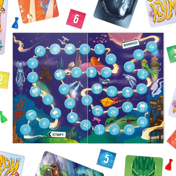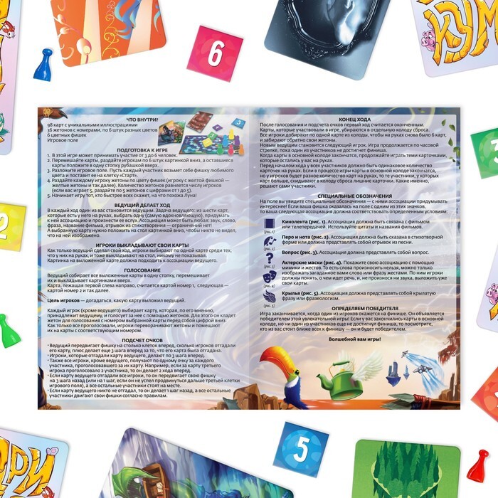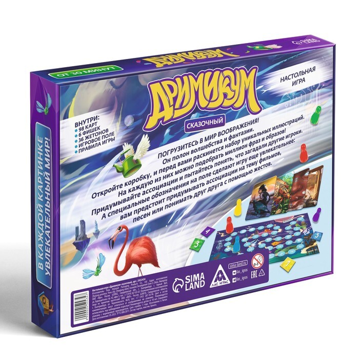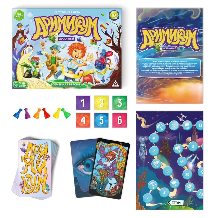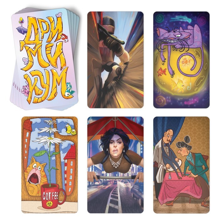 Данная красочная игра основана на ассоциациях и содержит яркие карты с иллюстрациями, необычными и завораживающими, а также игровое поле. Каждый из участников получает определенное количество карт, после чего один из них загадывает свою карту, называя к ней ассоциацию. Остальные игроки выбирают из своих карт наиболее подходящую под ассоциацию, после чего кладут их в центр стола. Колода в центре перемешивается, открывается, после чего нужно отгадать самую первую загаданную карту. Кто справится с этим, продвинется по игровому полю. Помимо этого, в зависимости от нахождения на игровом поле, игроков ждут специальные задачи для загадывания, разнообразящие игру.