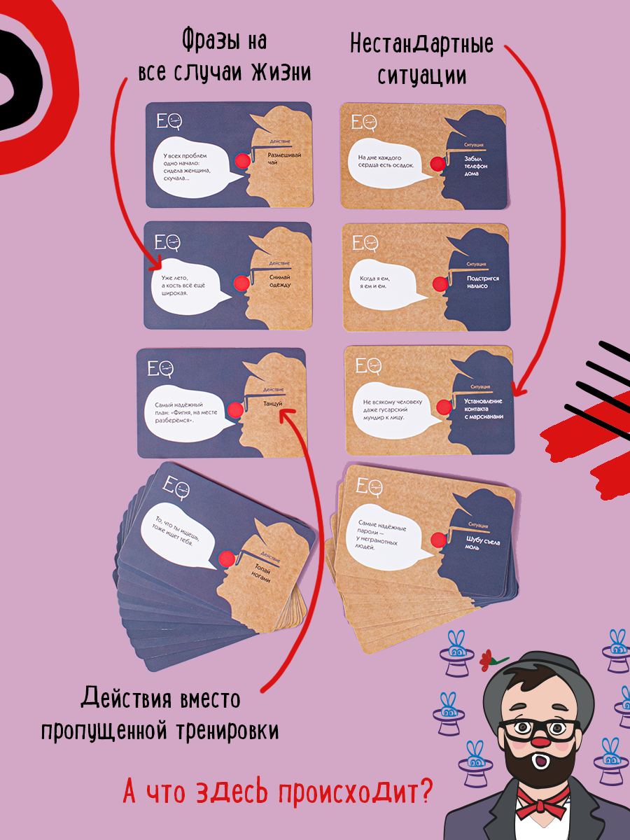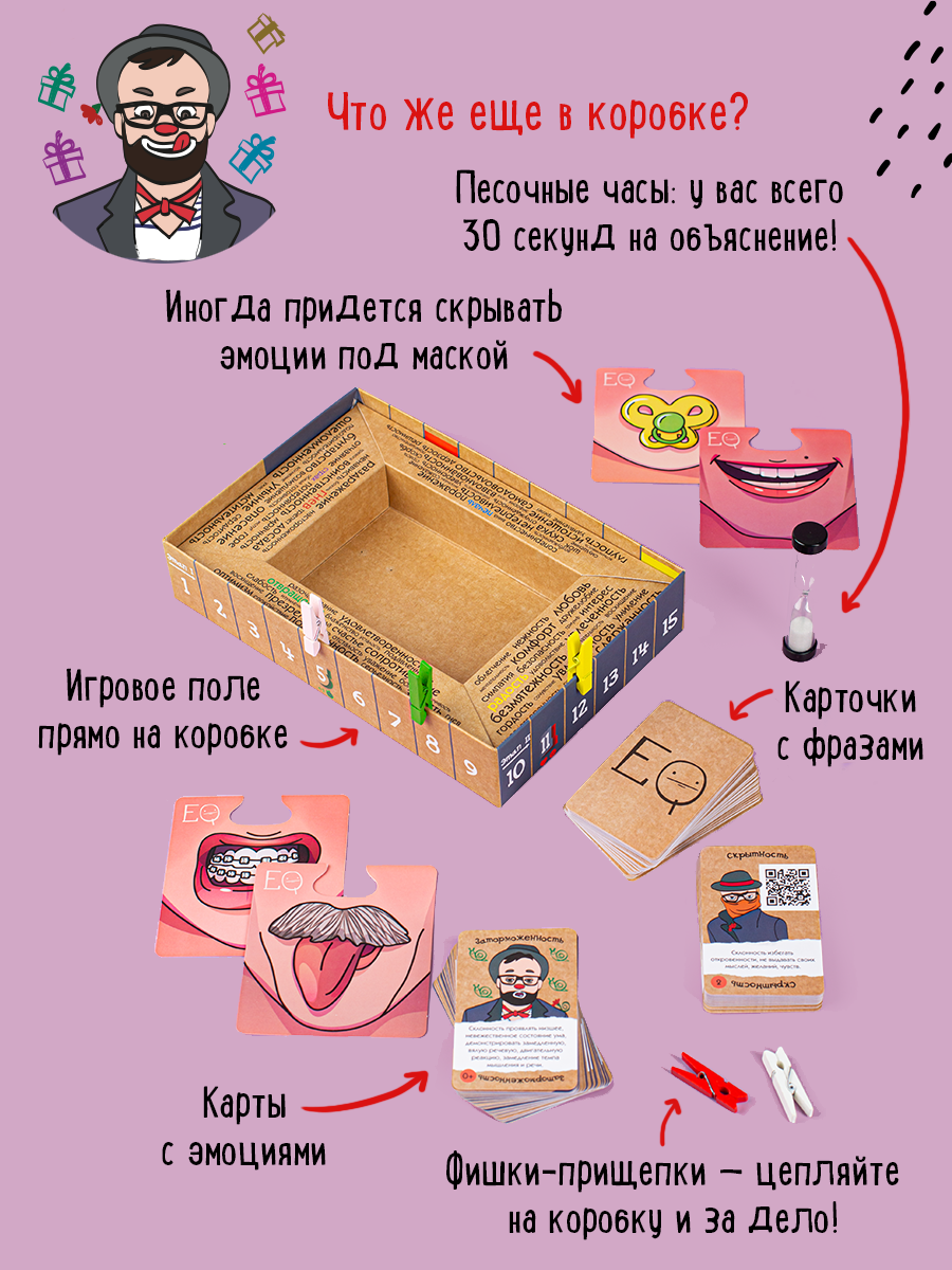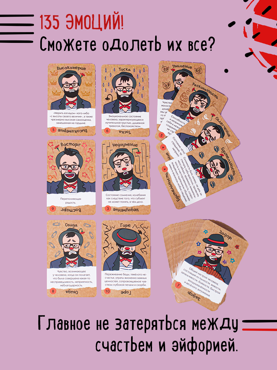 В данной настольной игре участники потренируются в угадывании эмоций друг друга. Карты с эмоциями и фразами раздаются всем игрокам. Один из них загадывает другому определенную эмоцию, но так, чтобы остальные этого не слышали. Второй игрок берет карту фразы и зачитывает ее с загаданной эмоцией. Остальные участники подбирают из своих карт наиболее похожую, на их взгляд, на произнесенную эмоцию. После чего колода в центре стола перемешивается, открывается, и игроки голосуют за самую первую загаданную карту. Кто отгадает ее правильно, получит победные очки и станет ближе к победе!