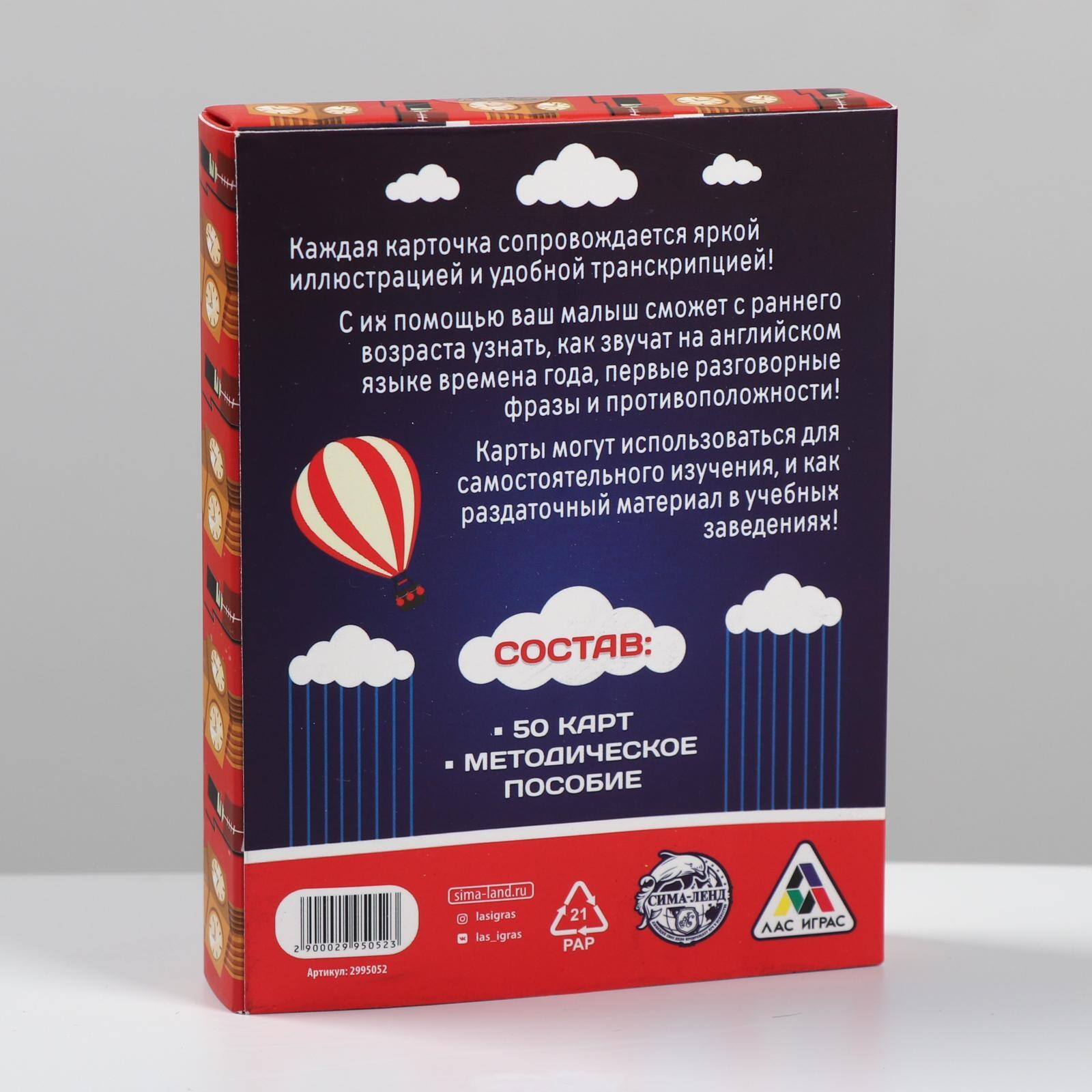В коробке вы найдете яркие изображения и их названия на английском языке с транскрипцией. Благодаря этому ребенок сможет легко и быстро запомнить английские слова, а также пополнить свой словарный запас.