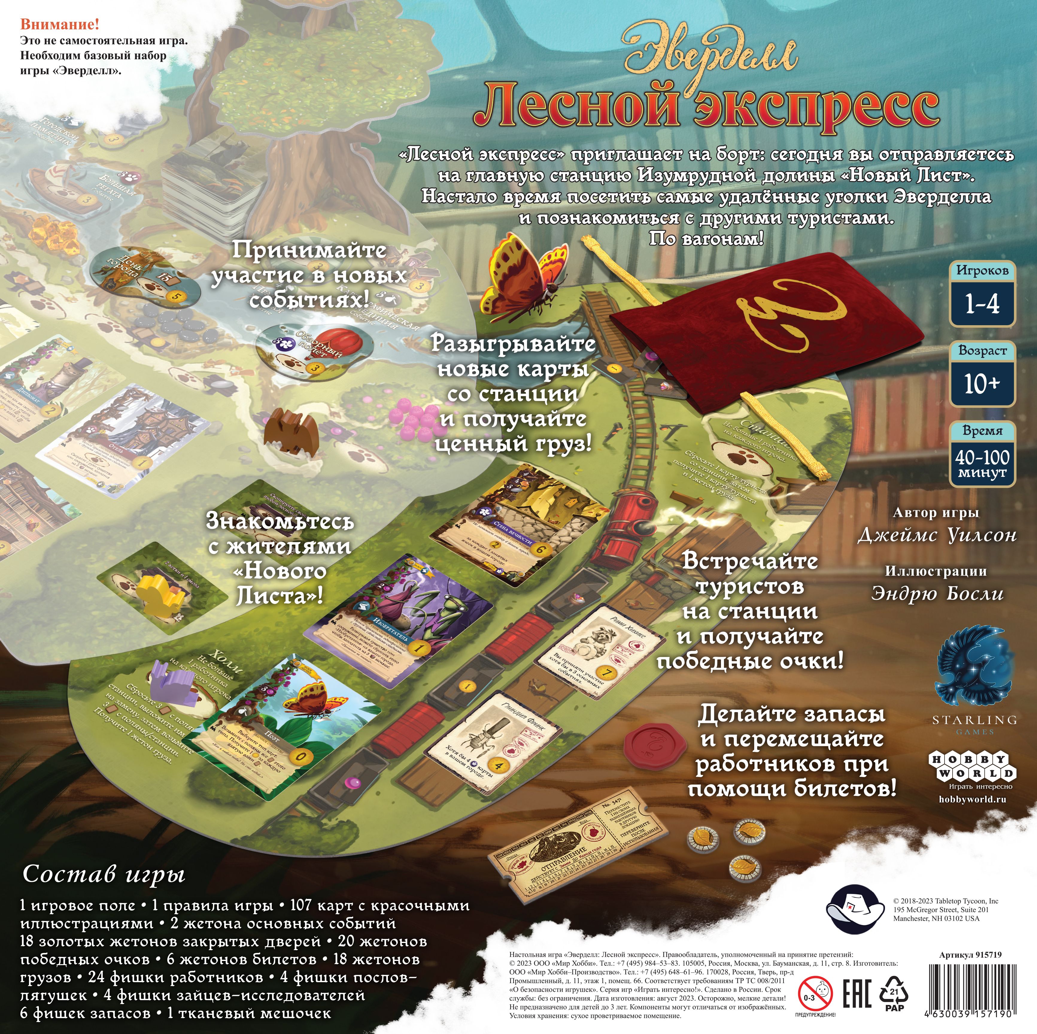 В новом дополнении для знаменитой настольной игры участников ждет новое игровое поле, добавляющееся к классической карте. Теперь по волшебному лесу будет колесить самый настоящий поезд, а игроков ждут знакомства с новыми персонажами, а также новые возможности для развития и процветания. Берите билет на поезд, ознакомьтесь с новыми событиями и приведите ваш лесной город к процветанию!